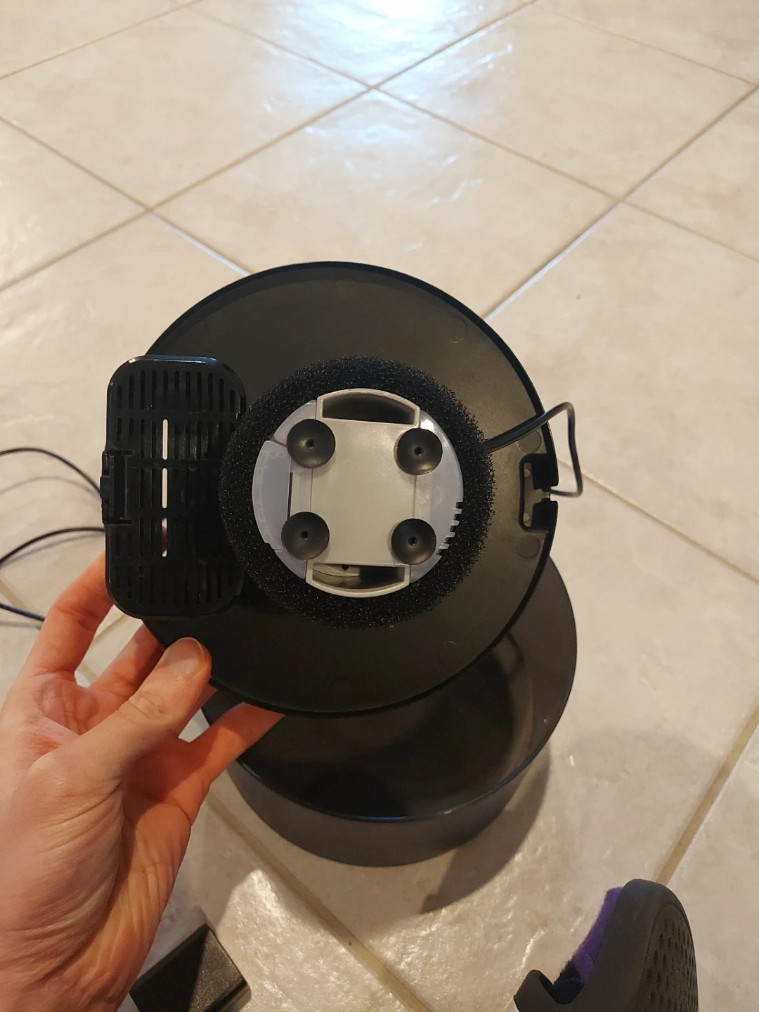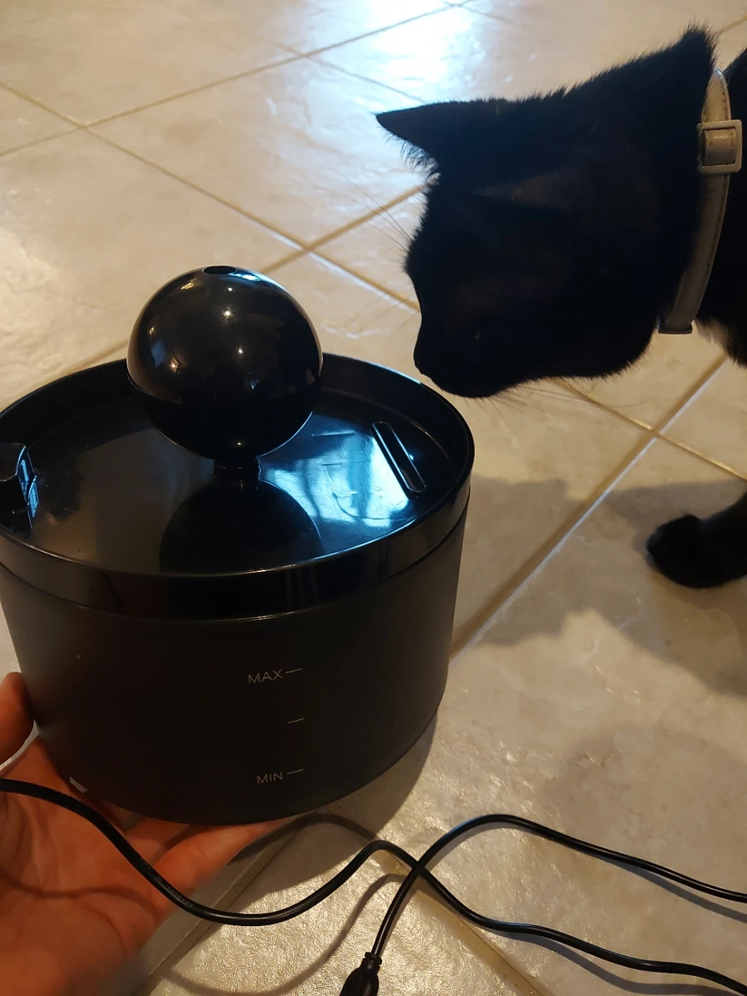 Black water fountain (generally for cats). Needs a drain filter, but is otherwise clean and ready to use. Power cord is roughly 1m long.