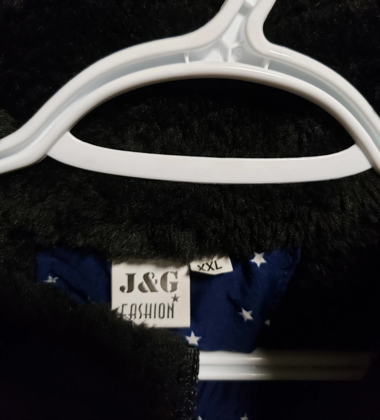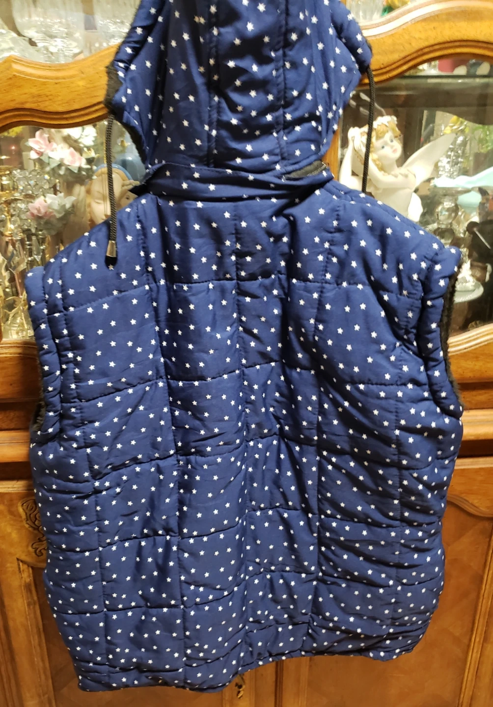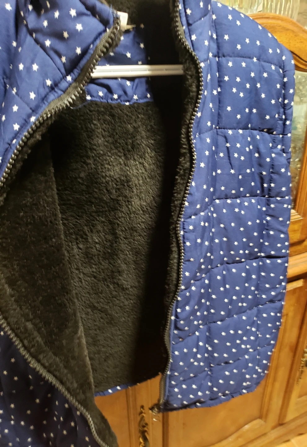 Blue puffer vest with a white star pattern. It's lined with fuzzy black material for extra warmth and has a full zipper closure. The hood is attached and can be zipped away into the collar.