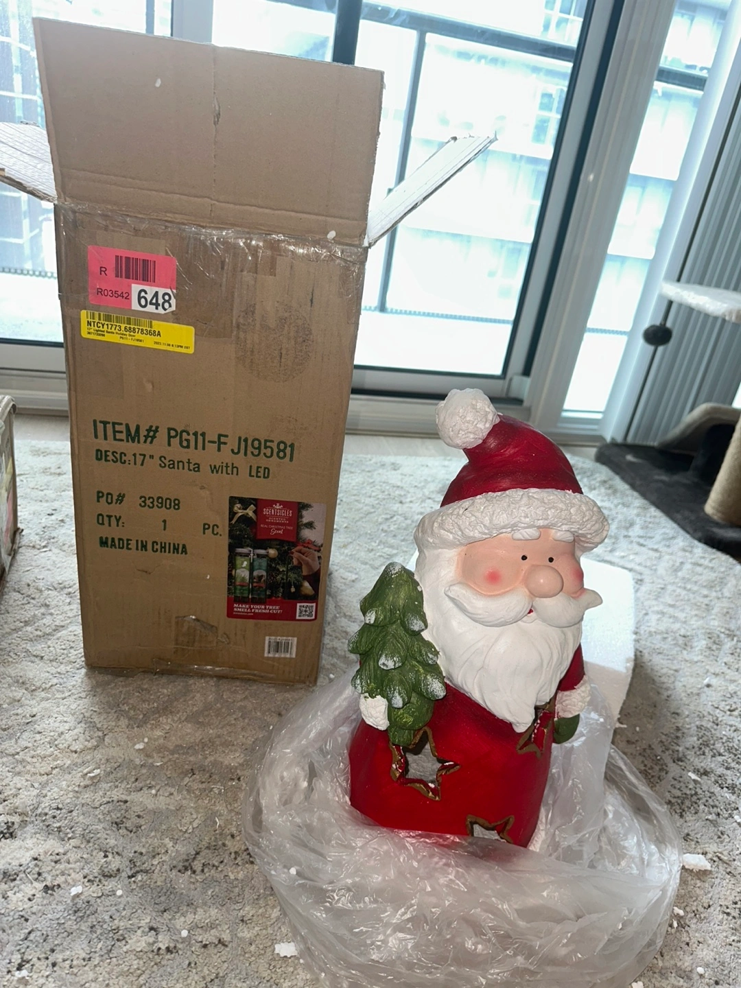 17 inch lighted Santa Claus figurine. Red and white colour scheme. Holds a small artificial Christmas tree. Features star cutouts with LED lights. Made in China.