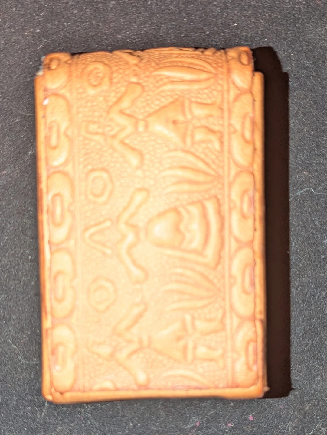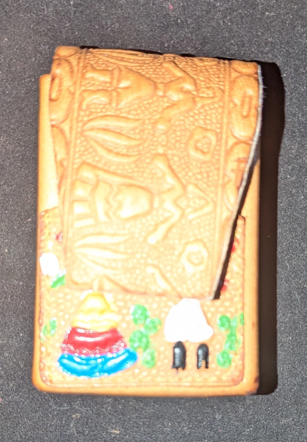 This is a really unique leather cigarette case! It has a beautiful folk art design embossed on the front and a slide-out compartment for your smokes