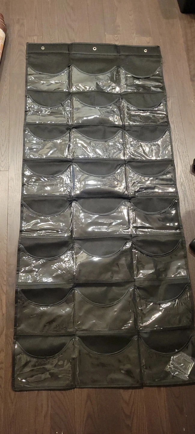 Black fabric over-the-door organizer with 20 clear plastic pockets. It's great for storing shoes,base ball hats accessories, or small items. Includes hooks for hanging.