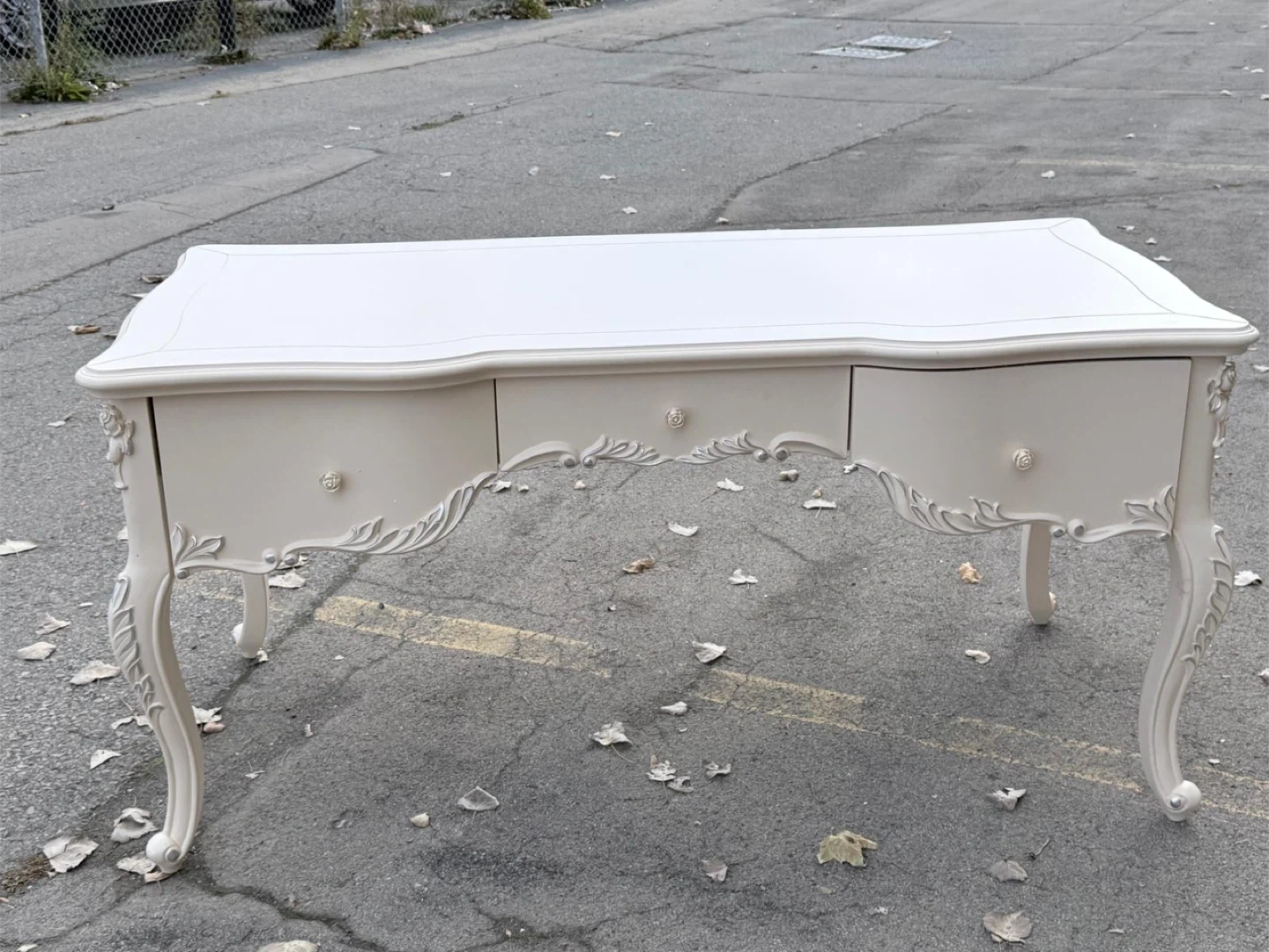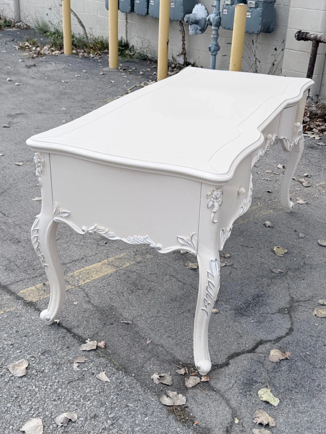 Selling a lovely antique-style desk. It features a creamy white finish and elegant floral carvings. The desk has three drawers with green felt lining, perfect for storage. It would make a beautiful addition to any room!