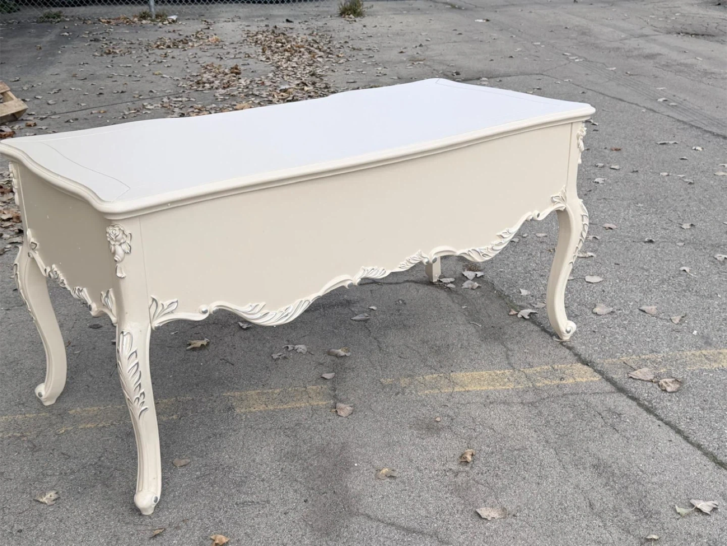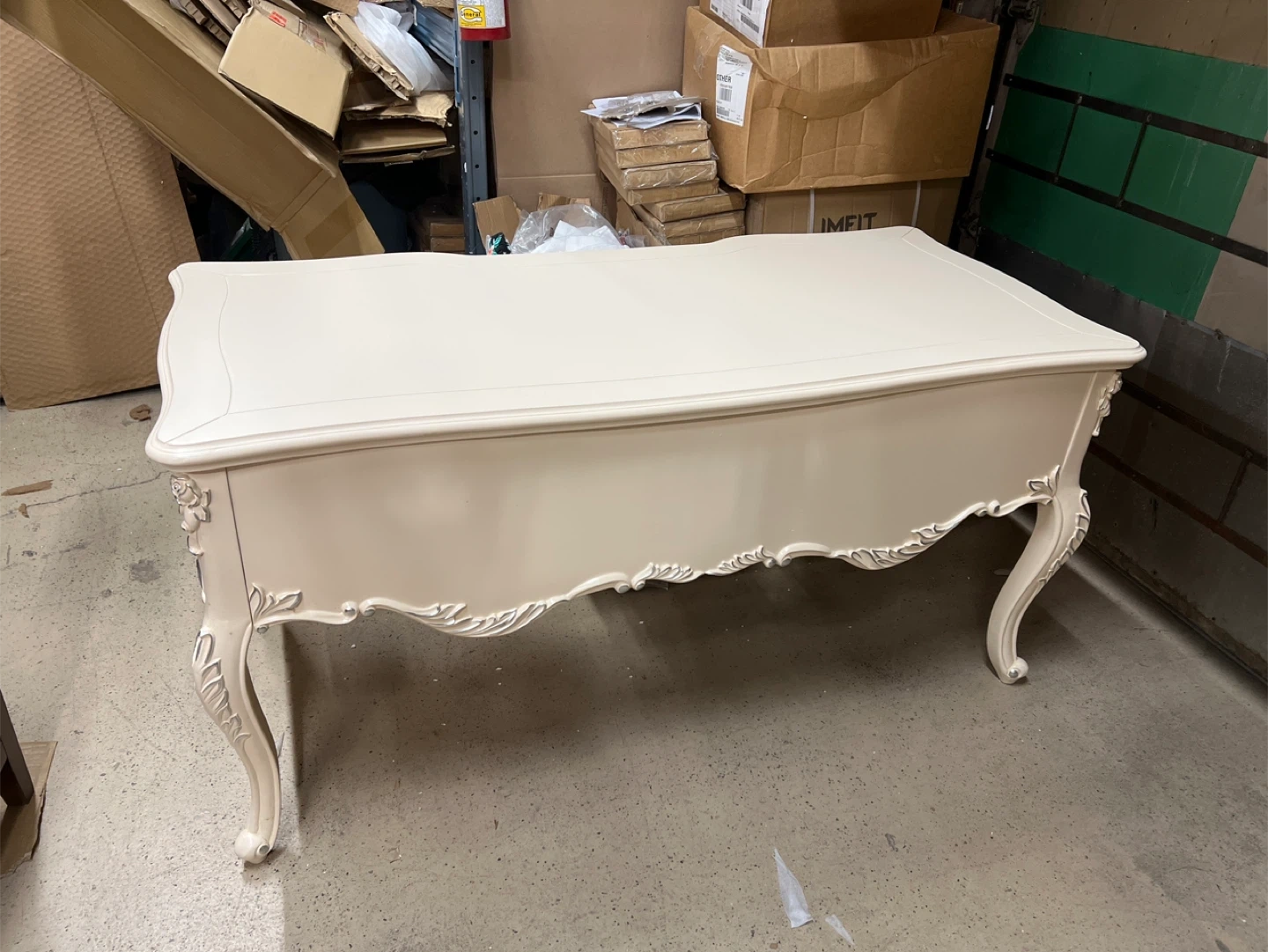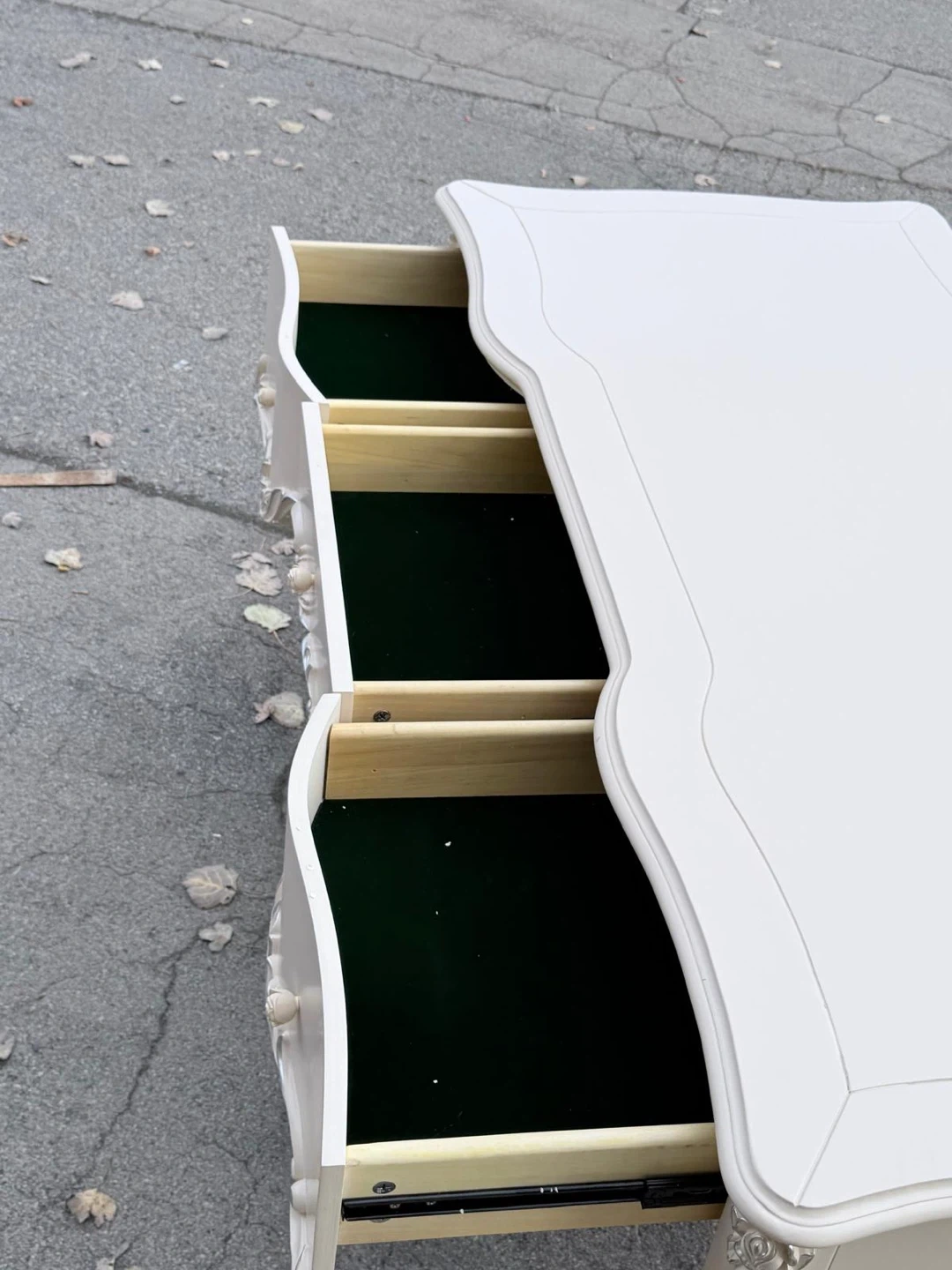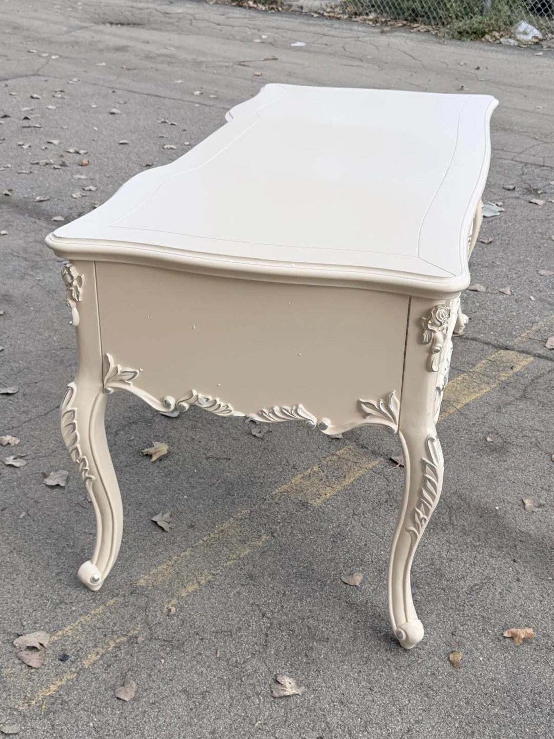 Selling a lovely antique-style desk. It features a creamy white finish and elegant floral carvings. The desk has three drawers with green felt lining, perfect for storage. It would make a beautiful addition to any room!
