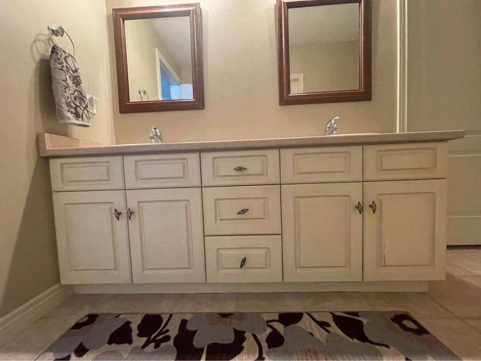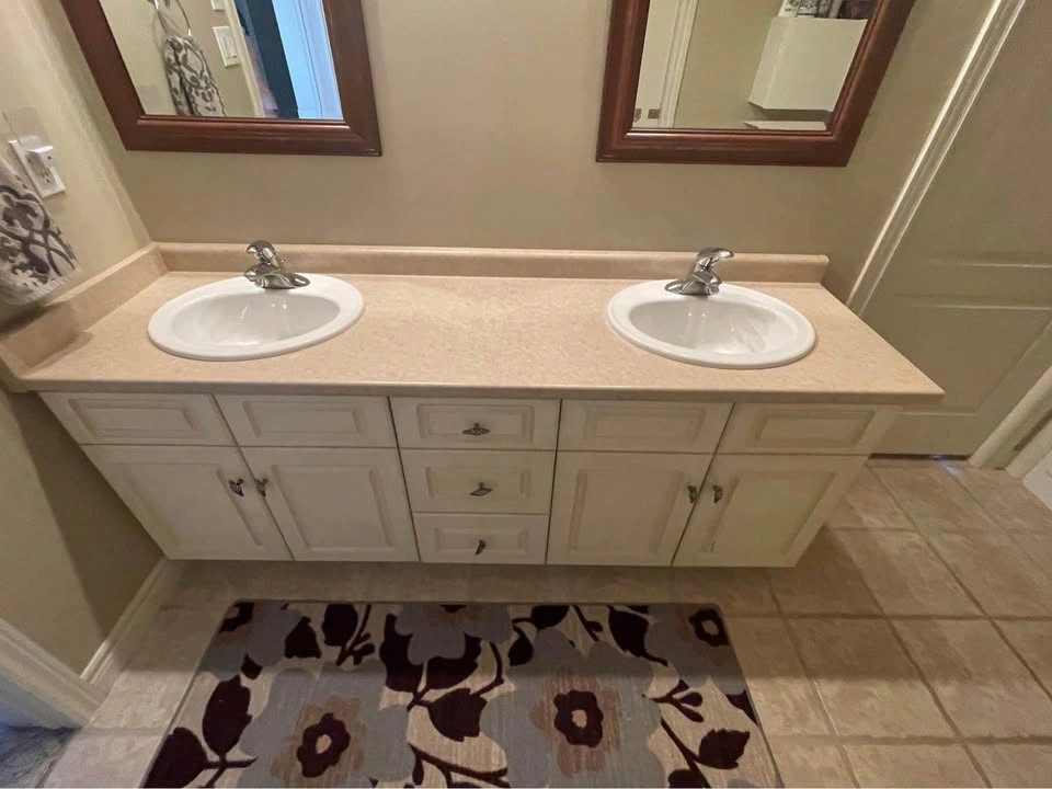 Double sink vanity, 77" length, 22" deep, 32" counter top height. Includes backsplash (35"). Comes with two Koehler sinks and two Moen faucets.