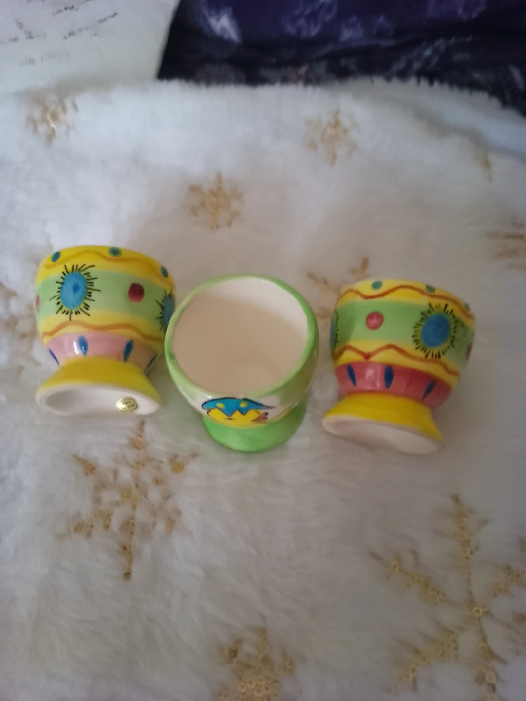 Three ceramic egg cups with fun Easter designs. Features colourful patterns and a chick illustration. These cups are perfect for your Easter brunch table!