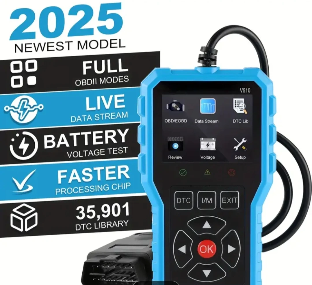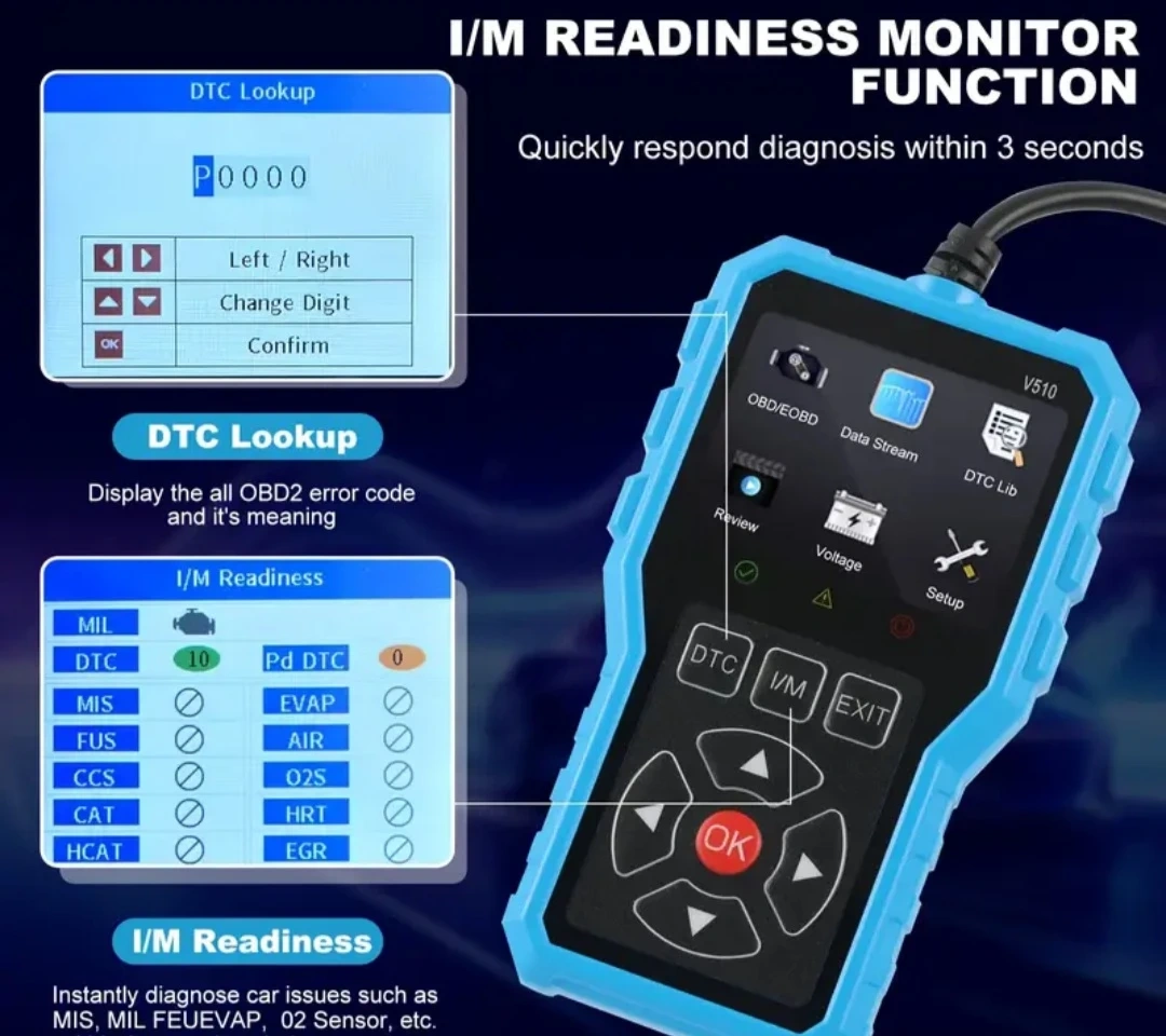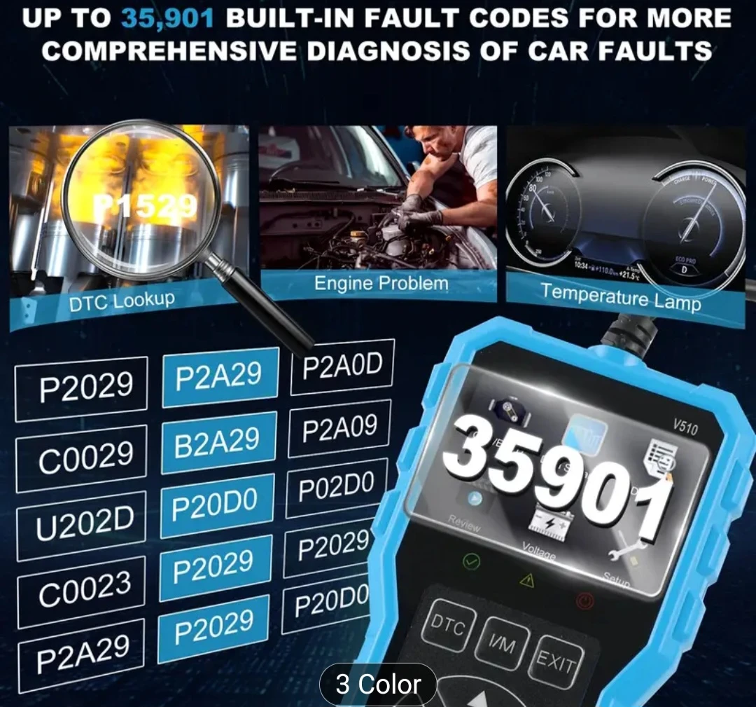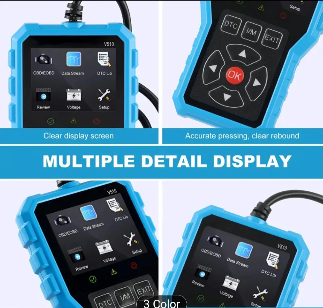 This V510 OBDII car diagnostic tool supports up to 35,901 built-in fault codes for comprehensive diagnosis. It features a 2.8-inch colour LCD display for clear viewing of test results. The device quickly responds to diagnosis within 3 seconds, offering I/M Readiness for instant car issue diagnosis.