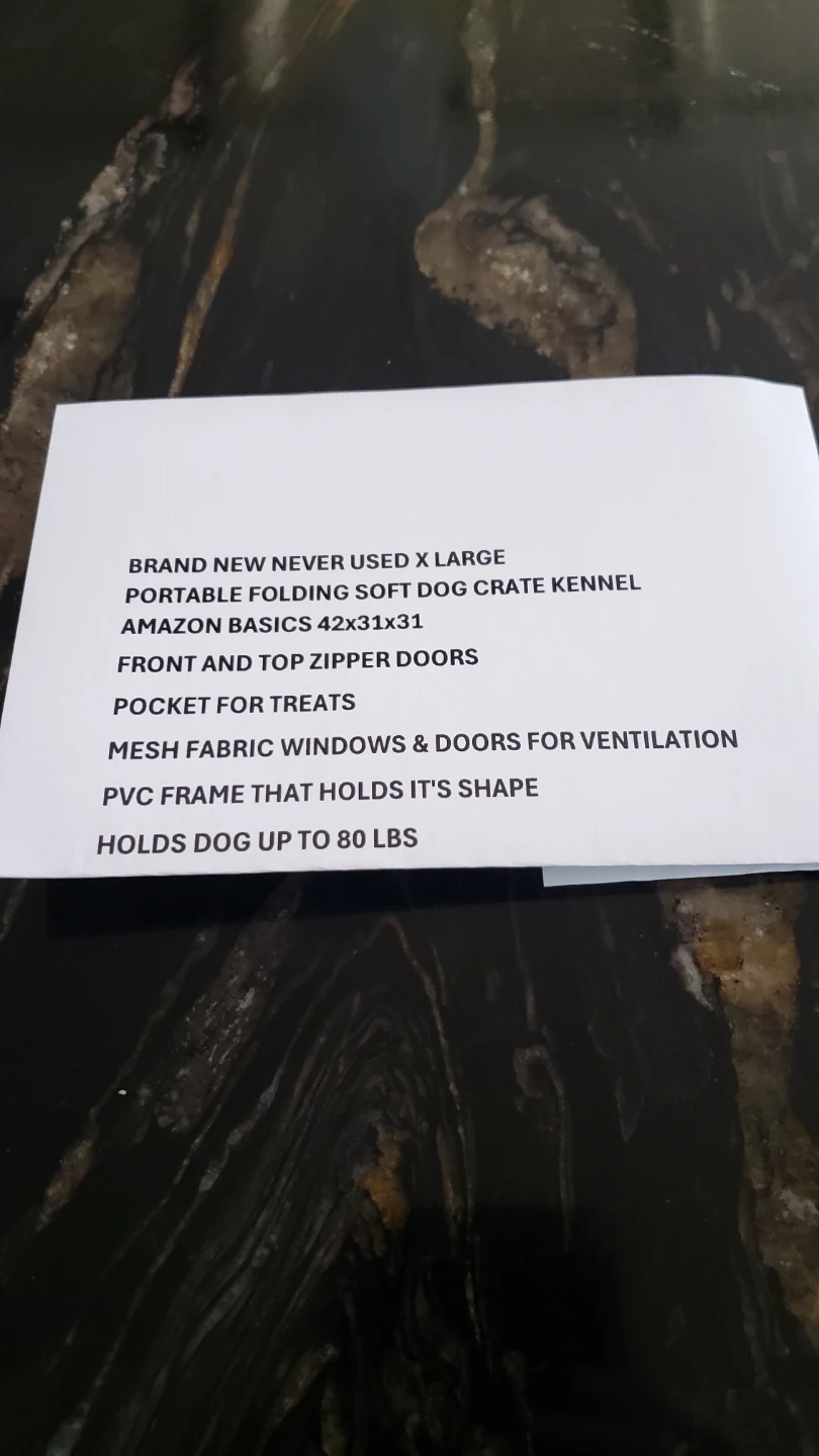 Selling an Amazon Basics portable soft folding pet kennel.It measures 42 inches and is made of 100% polyester. New never used.Price firm $100