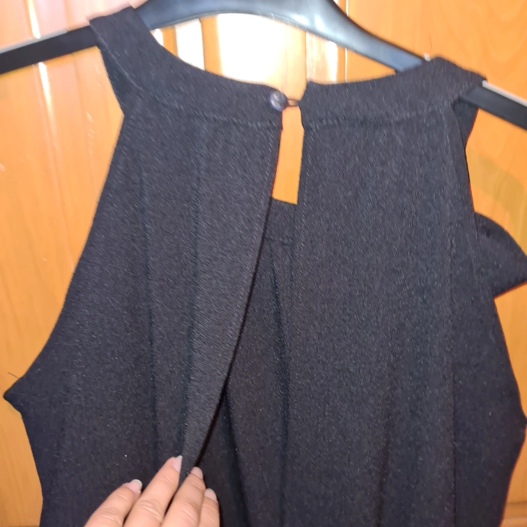 Open back. Button to close the top at the back of the neck. Zipper for the short.