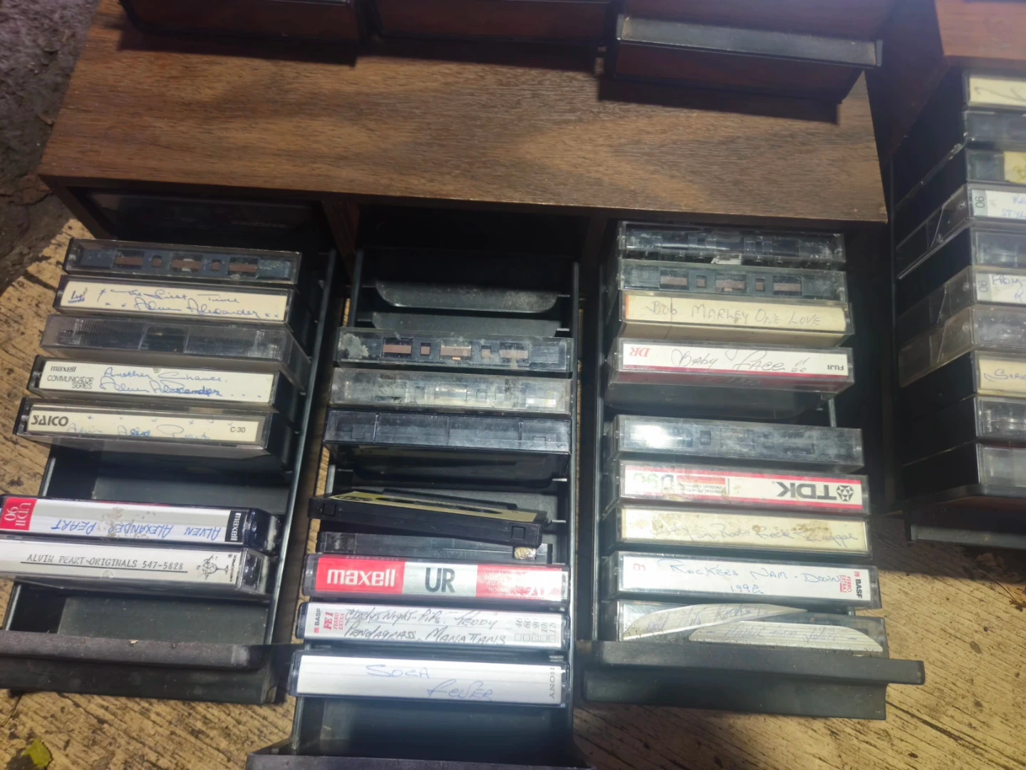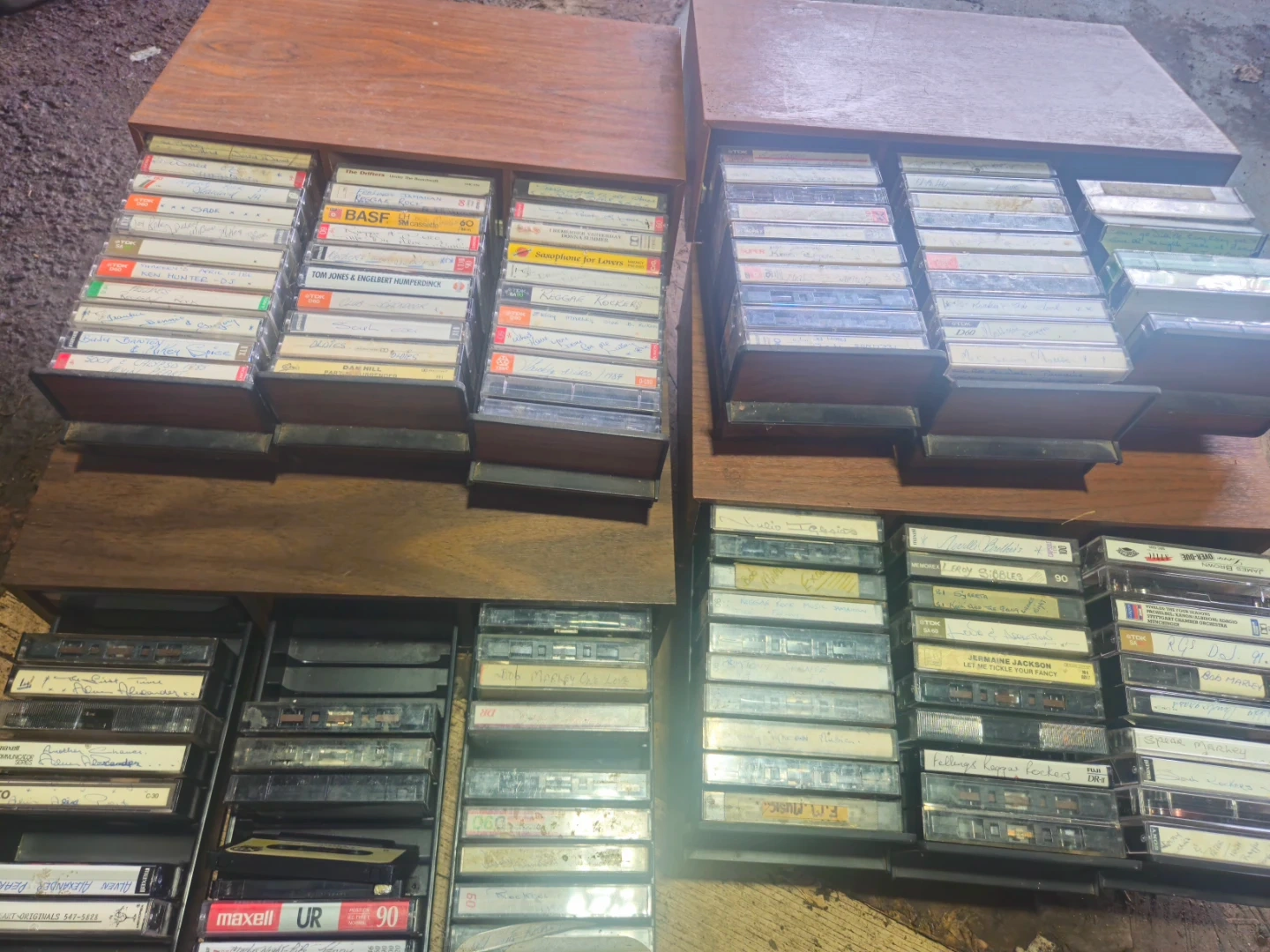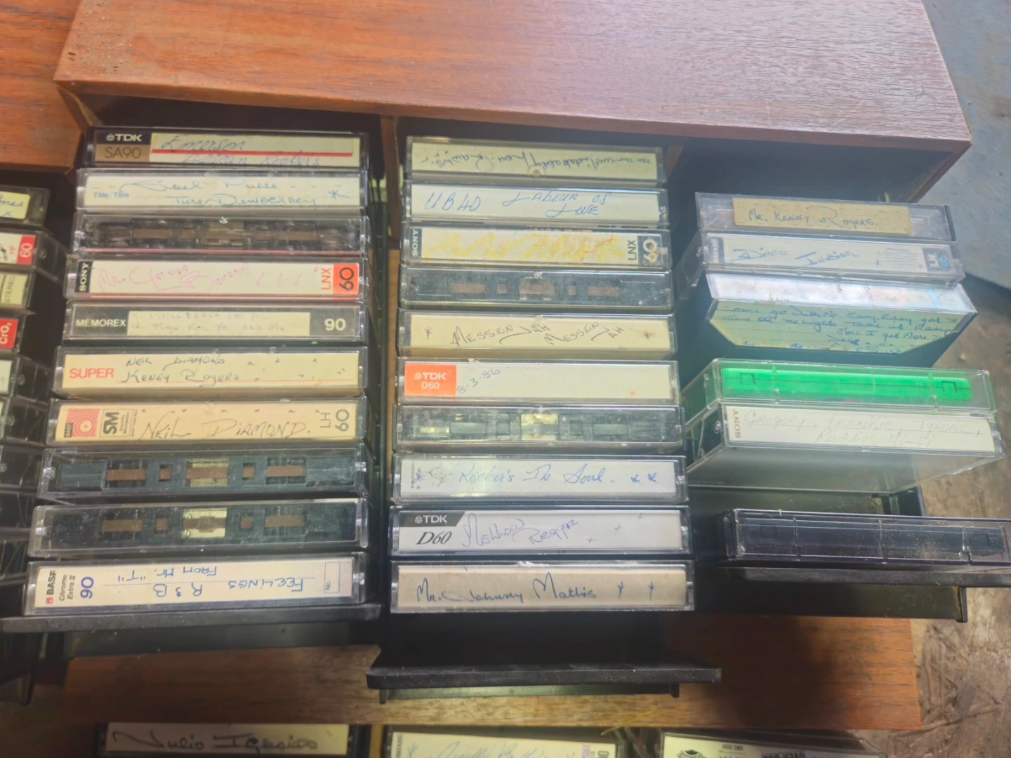Collection of various audio cassette tapes from brands like TDK, BASF, Memorex, and Maxell. Tapes include a range of artists and genres, many with handwritten labels. Great for collectors or those looking for vintage audio.
