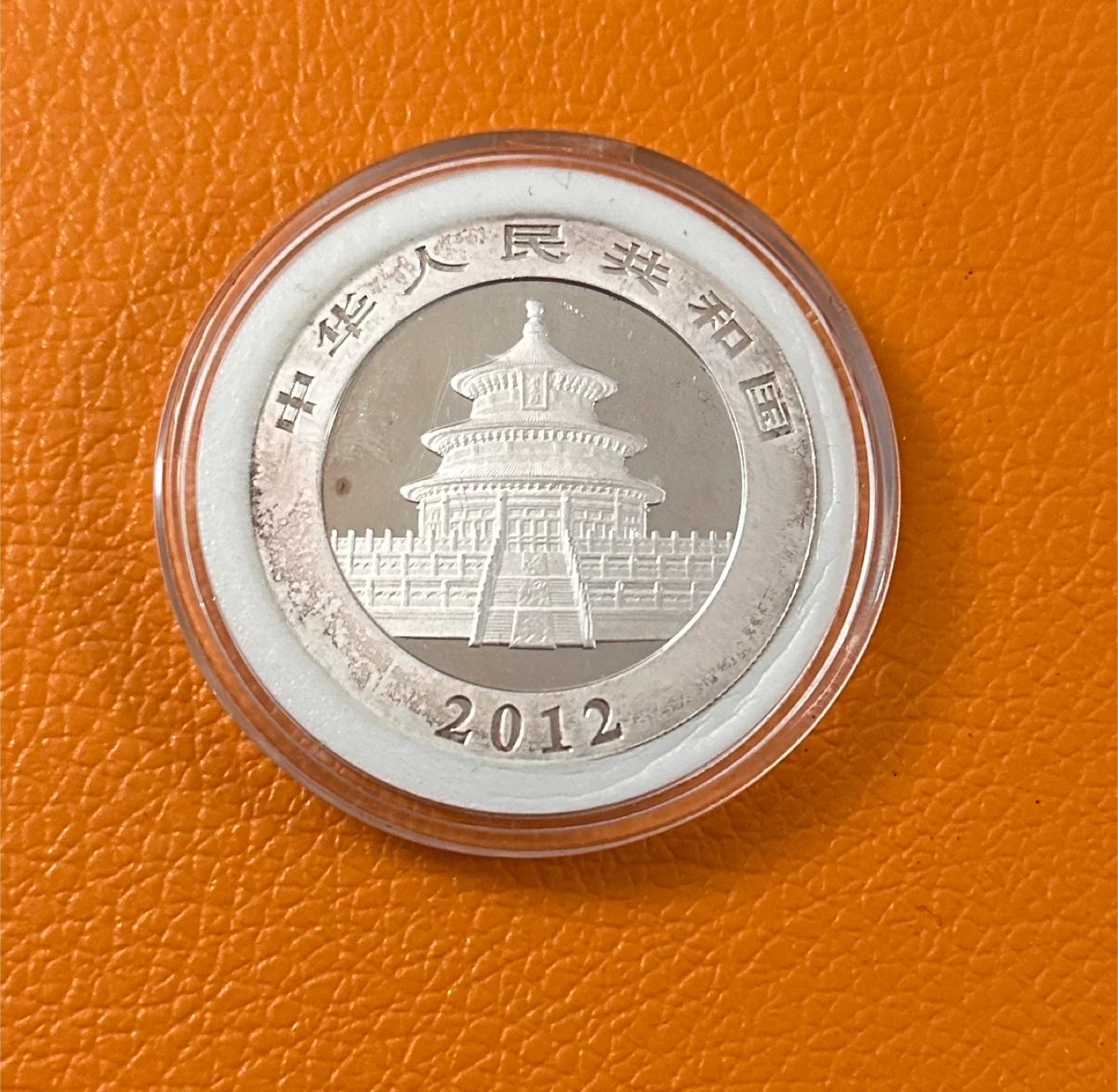 This item is a 2012 Chinese Silver Panda bullion coin, featuring a depiction of the Temple of Heaven in Beijing on its obverse side.