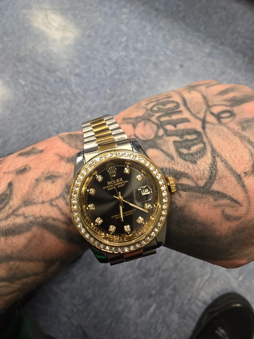 Rolex Oyster Perpetual Date Just watch with a black dial and diamond bezel. It features a two-tone stainless steel and gold band. This watch is a certified chronometer.