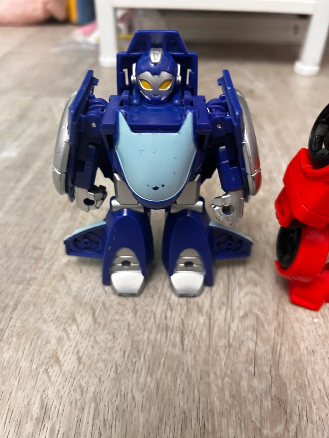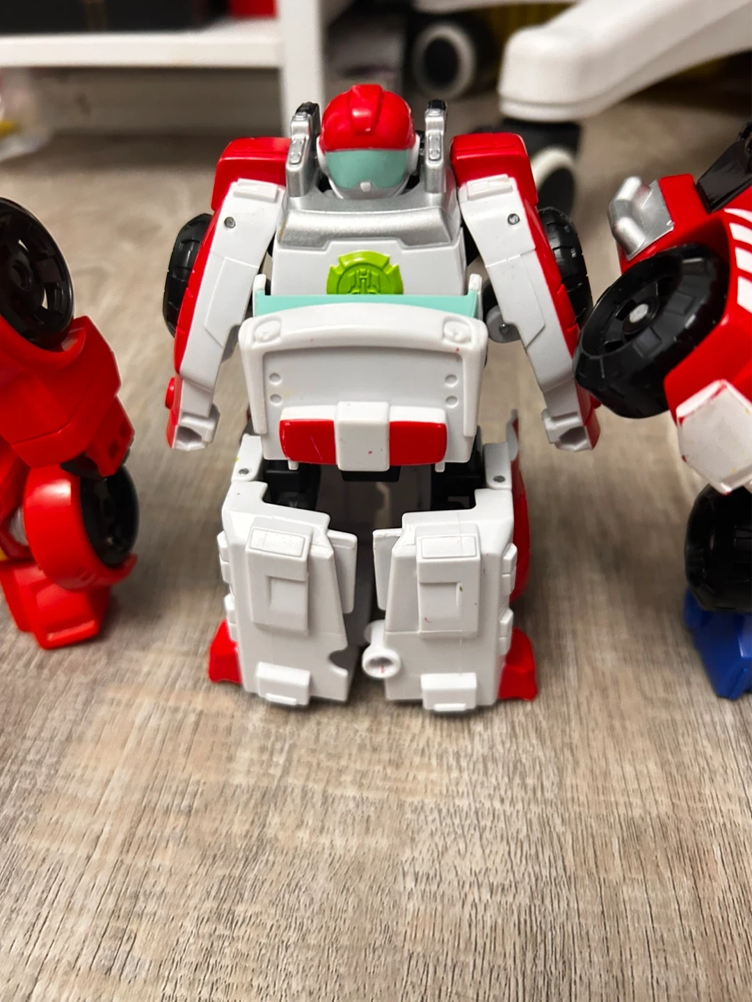 A set of four Transformers Rescue Bots figures. Includes a blue jet, red and yellow bot, white and red ambulance bot, and a red and blue truck bot. Plastic construction.