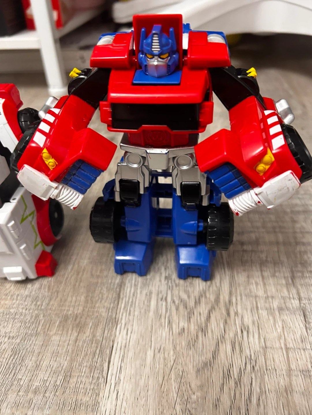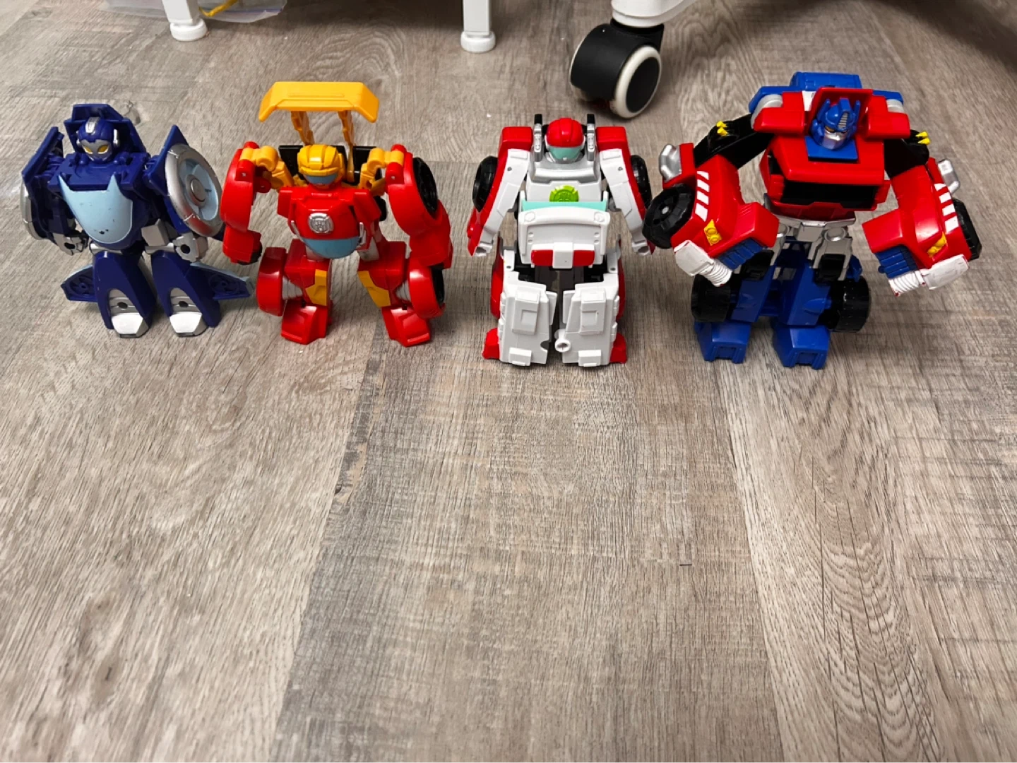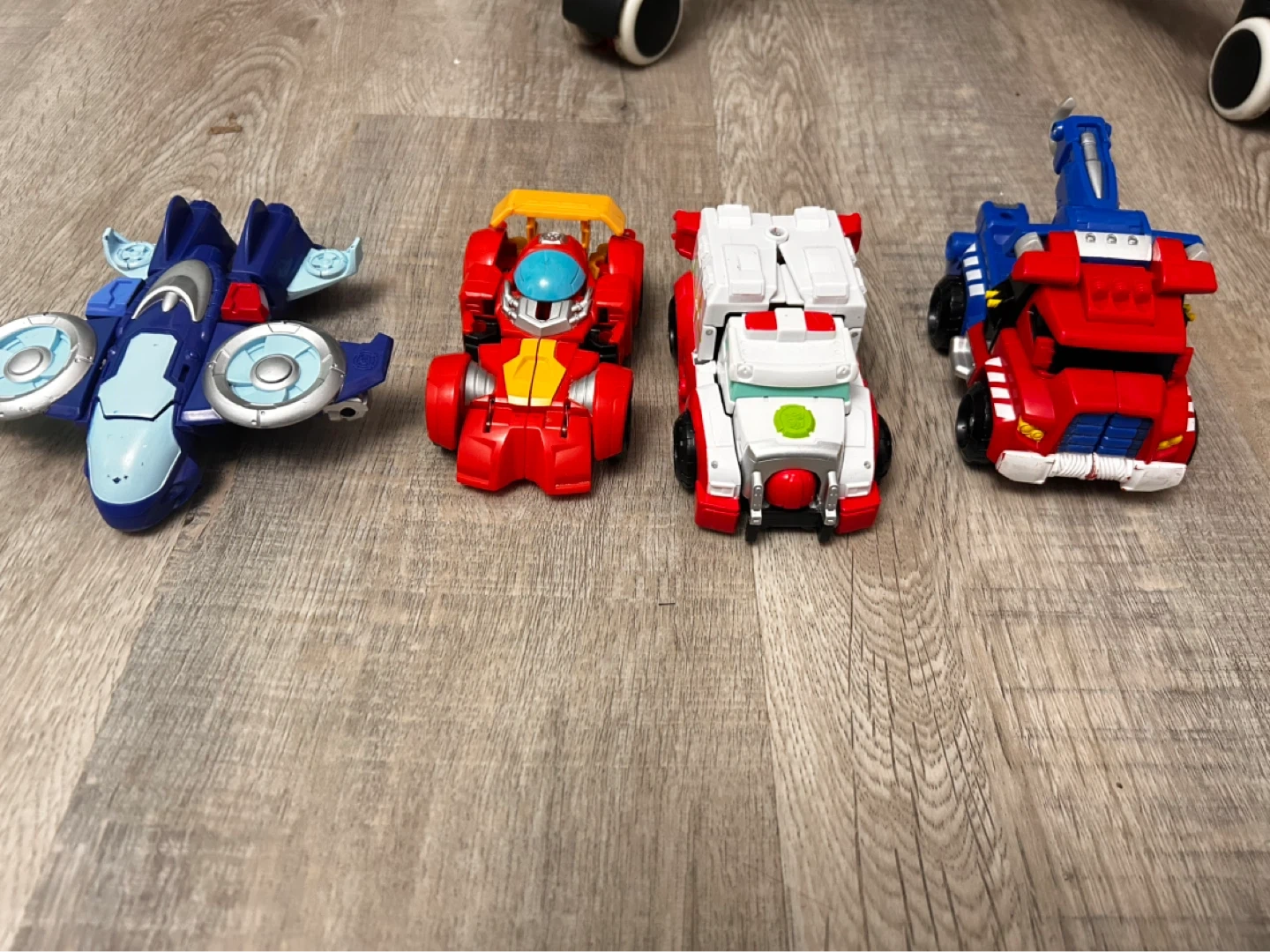 A set of four Transformers Rescue Bots figures. Includes a blue jet, red and yellow bot, white and red ambulance bot, and a red and blue truck bot. Plastic construction.
