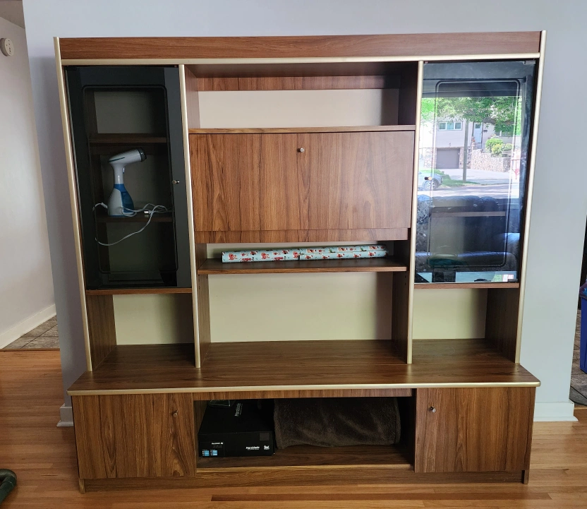 Selling a vintage wall unit with a mix of wood and glass elements. It offers plenty of storage and display space, perfect for adding a retro touch to your living room or den. It's in good condition and ready for a new home!