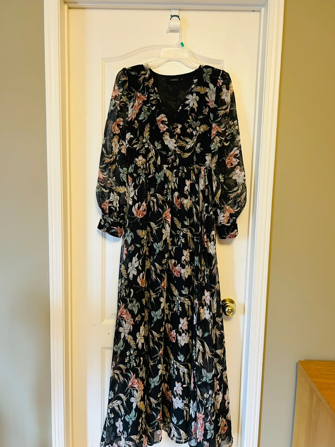 Black floral print maxi dress from Marina. It has long sleeves and a V-neckline. Sheer chiffon fabric.