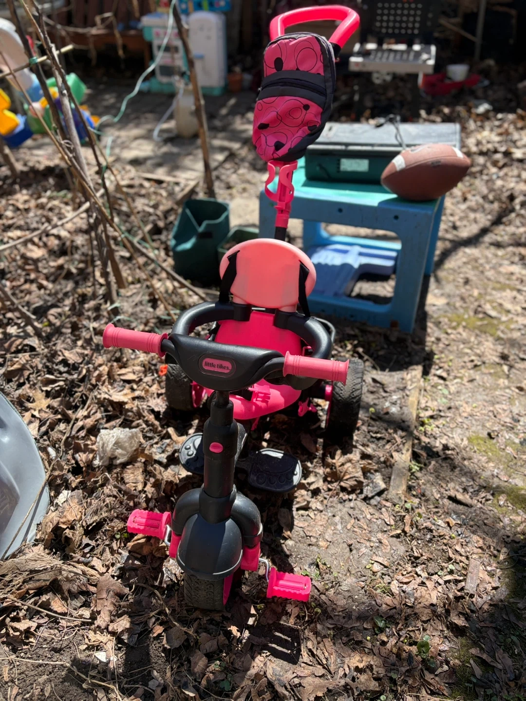This Little Tikes tricycle is a vibrant pink and black. It's designed for early riders with a secure seat and footrests. The parent handle allows for easy steering and control.