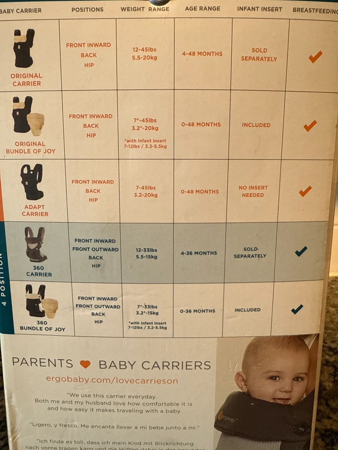 Selling an Ergobaby 360 baby carrier in excellent condition! It's a 4-position carrier designed for comfort through ergonomics. Suitable for babies to toddlers, with a weight range of 12-33lbs (5.5-15kg) or 7-33lbs (3.2-15kg) with infant insert. The carrier features a cooler with breathable mesh, lumbar support, and a foldable hood for sun protection. Comes with the original box!
