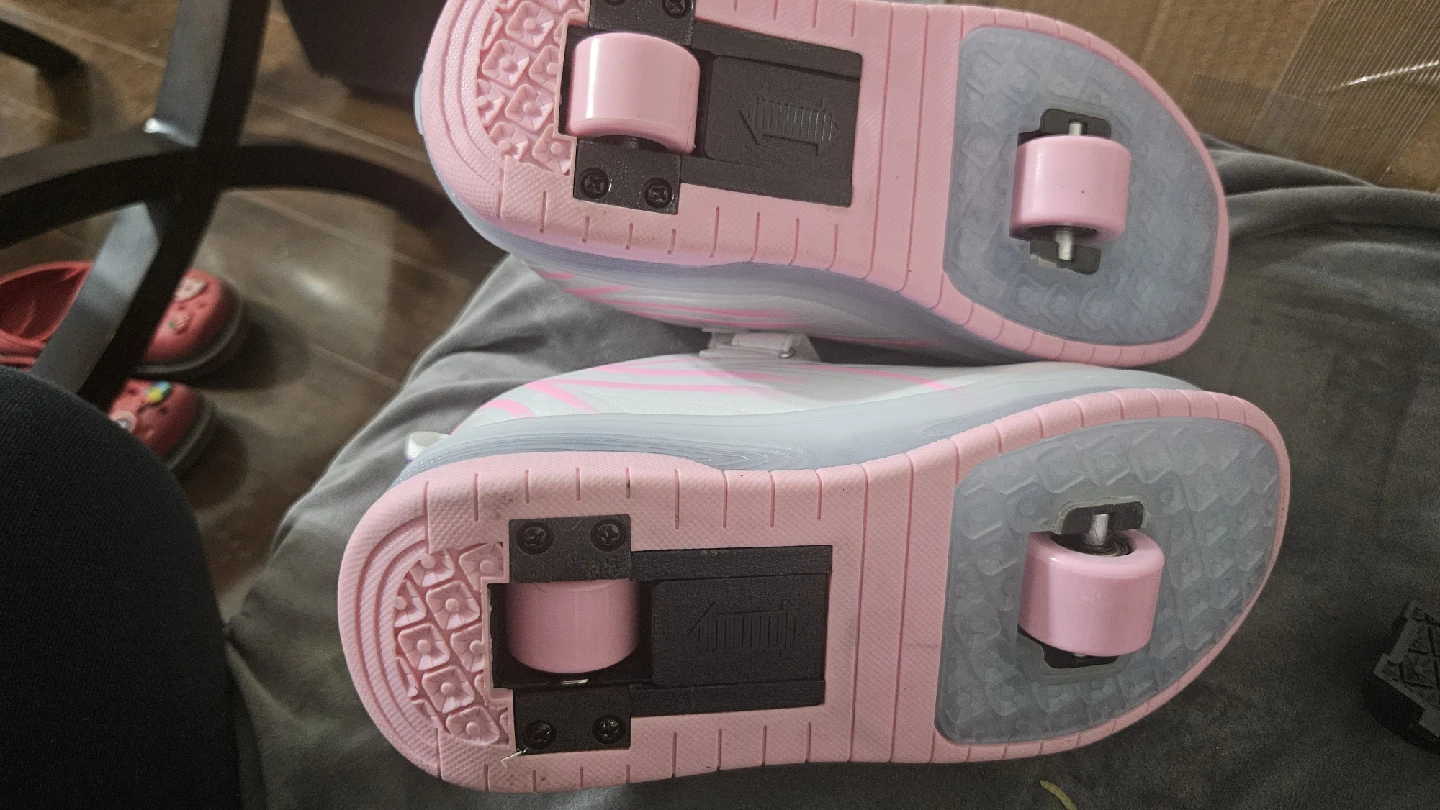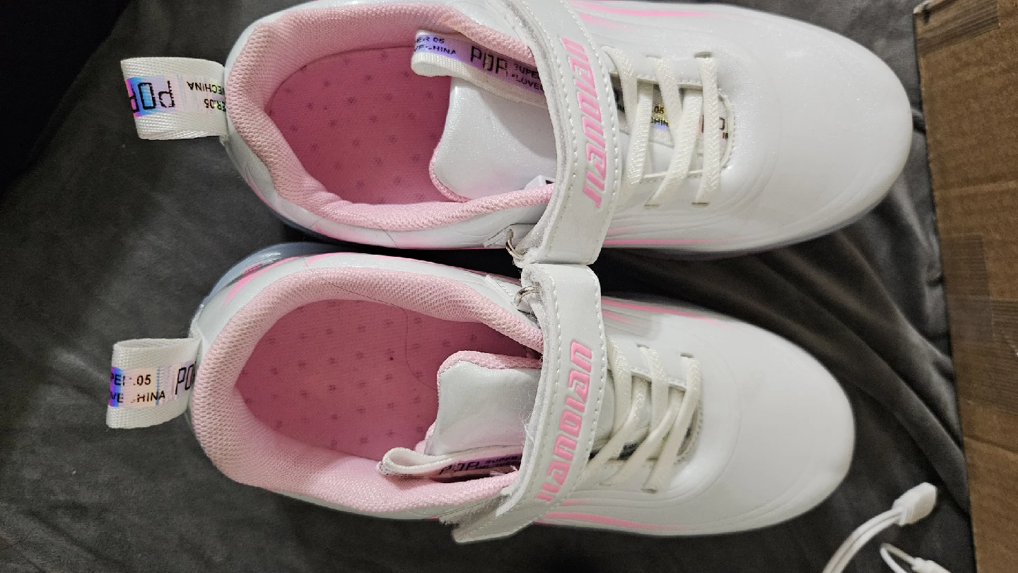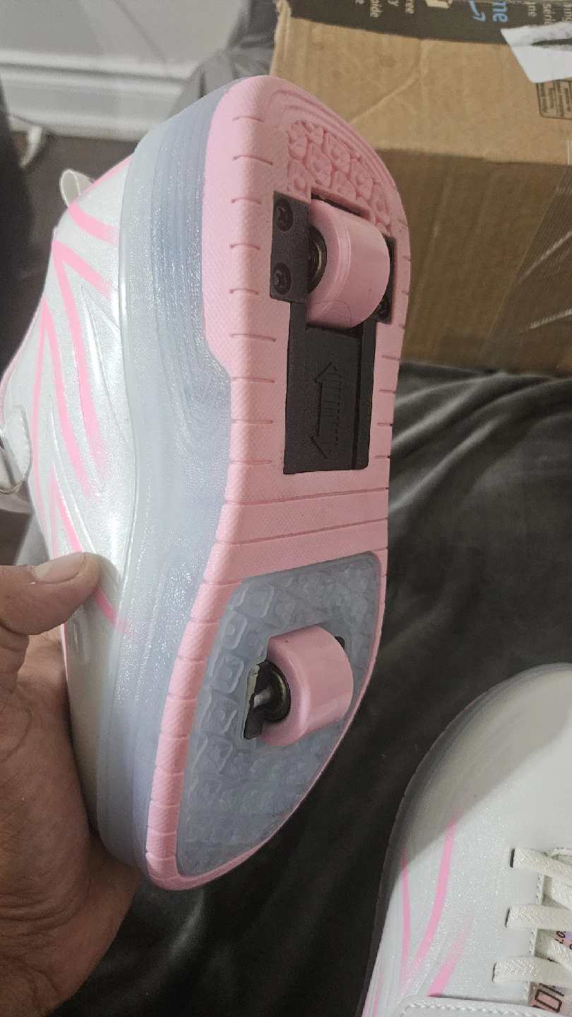 Cute JianDian roller skate shoes in white and pink! These shoes have retractable wheels so they can be used as regular sneakers too. Comes with the tool to retract the wheel, so you can switch between skating and walking anytime