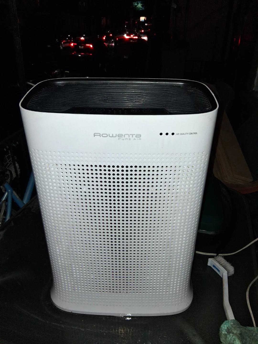 🥕This Rowenta air purifier helps improve indoor air quality. It features a white design with perforated panels for air intake. Air quality control indicators are present on the top panel.🥕