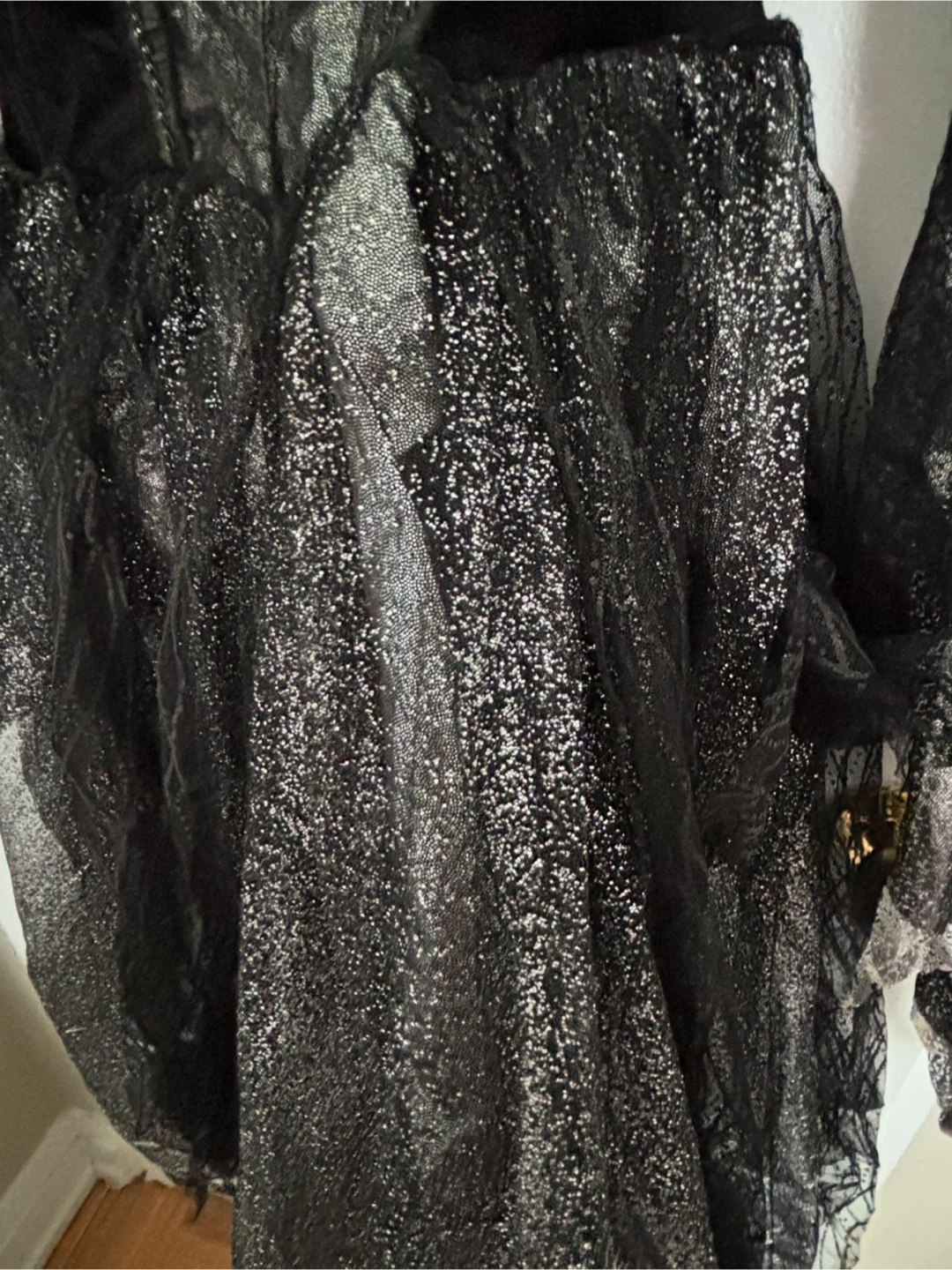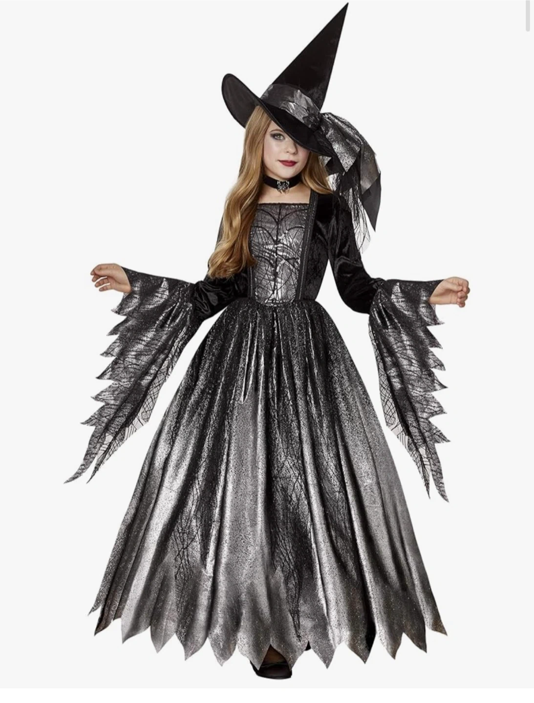 7-8 years.Selling a Spirit Halloween witch costume in size M.It's black and silver, perfect for Halloween or dress-up! Includes the dress and hat.