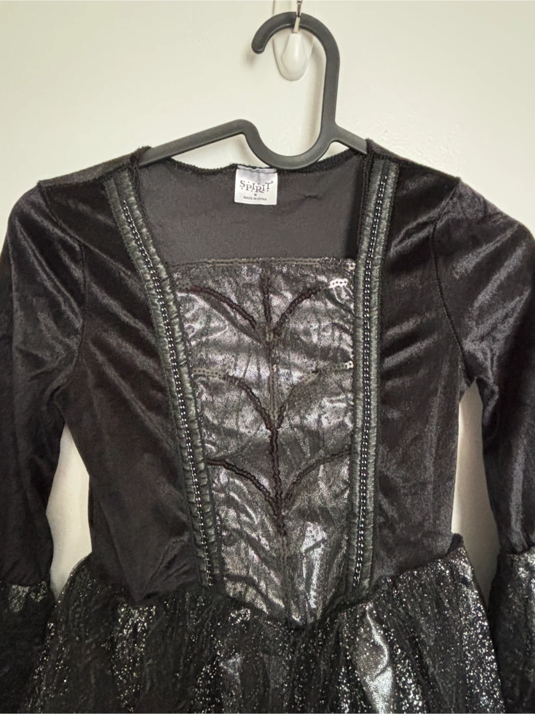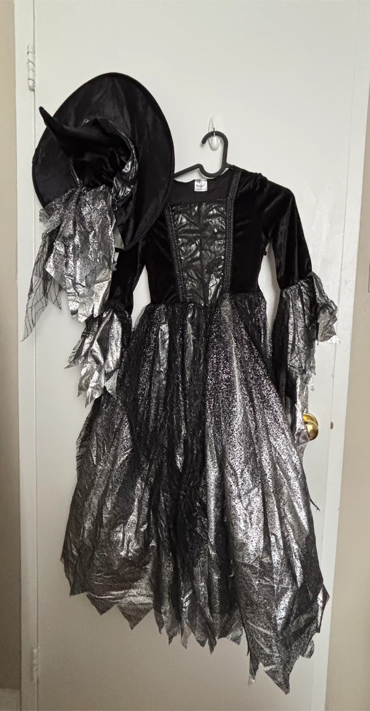 7-8 years.Selling a Spirit Halloween witch costume in size M.It's black and silver, perfect for Halloween or dress-up! Includes the dress and hat.