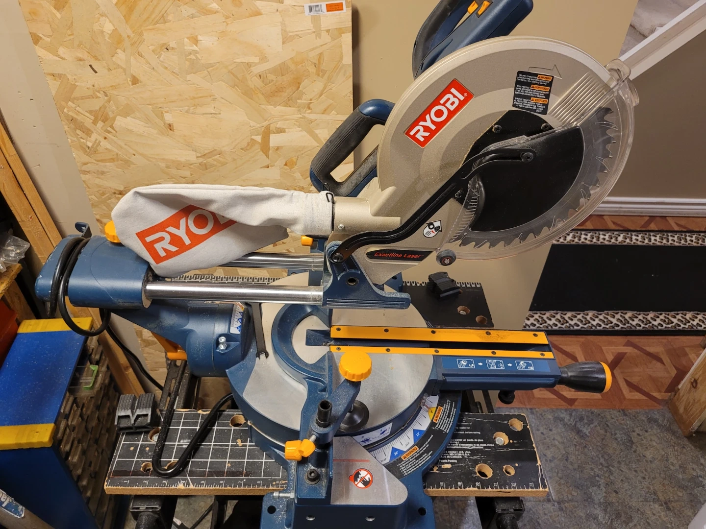 Ryobi miter saw with Exactline laser guide for accurate cuts. Includes a dust collection bag. Great for carpentry projects!