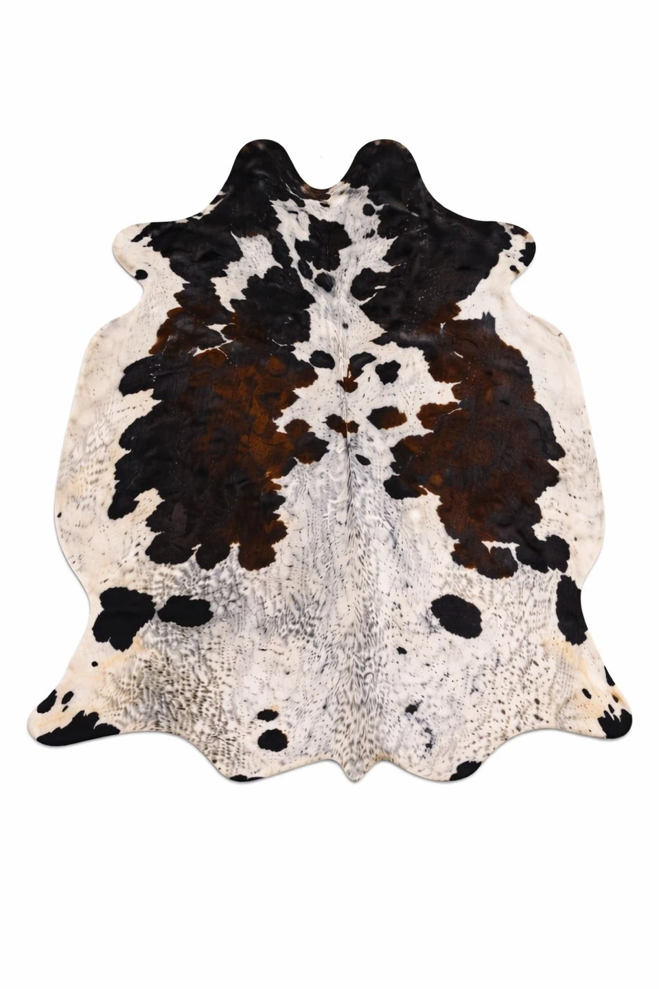 This is a genuine cowhide rug with a classic black, white, and brown pattern. It's a unique piece that adds a natural and rustic touch to any room. The hide is a real animal skin.