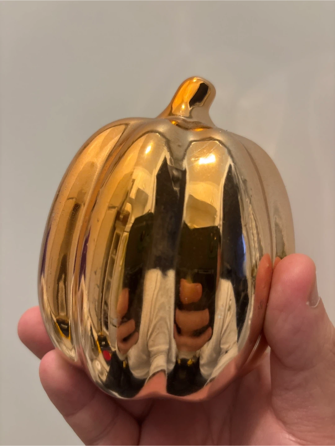 This decorative ceramic pumpkin has a shiny gold finish. It's a festive accent piece for autumn or Halloween displays. Great for adding a touch of seasonal elegance to your home!