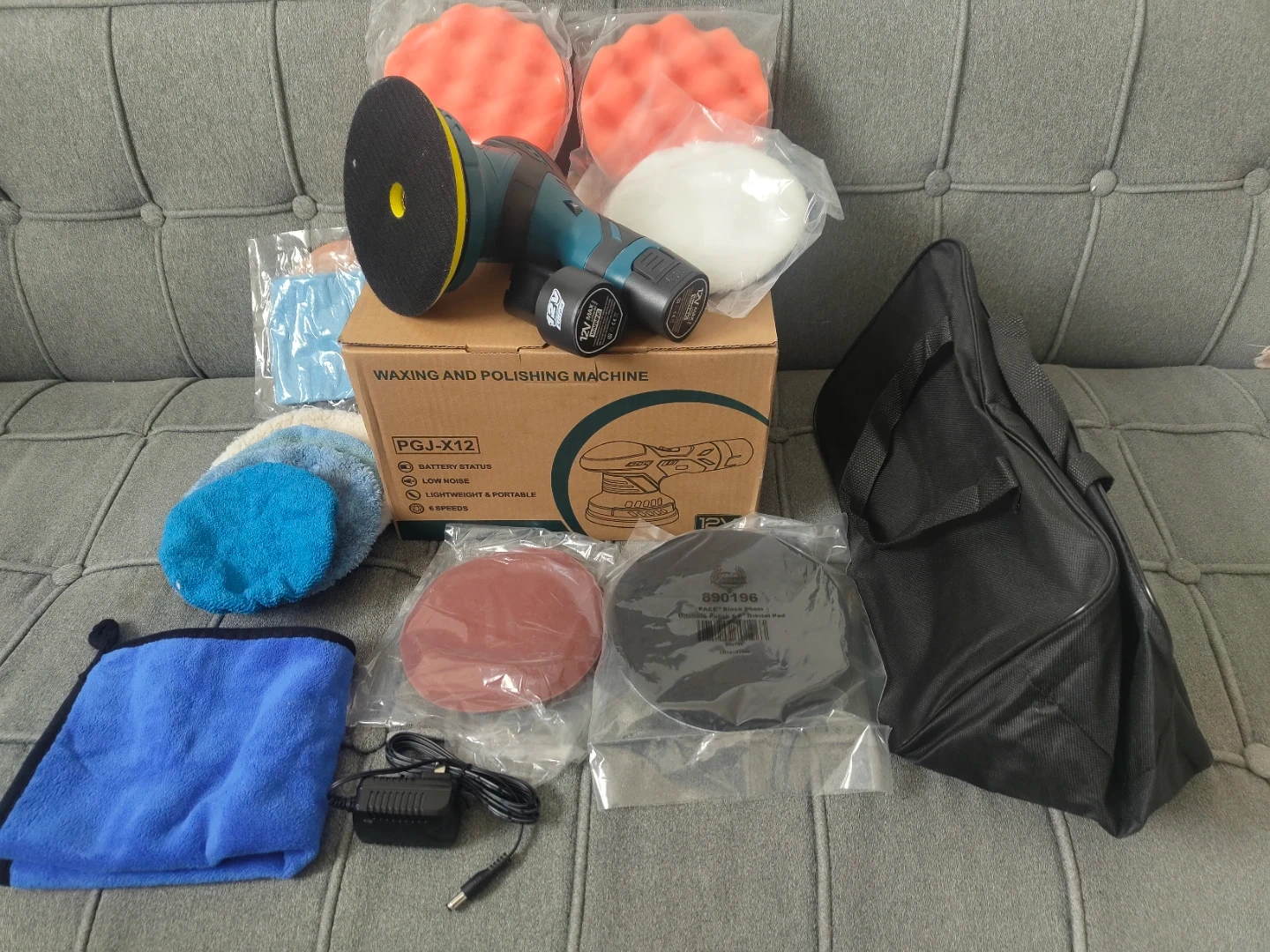 This is a brand new cordless waxing and polishing machine for car. It comes with multiple polishing pads, a charging cable, extra battery and a carrying bag. Variable speed settings are available.