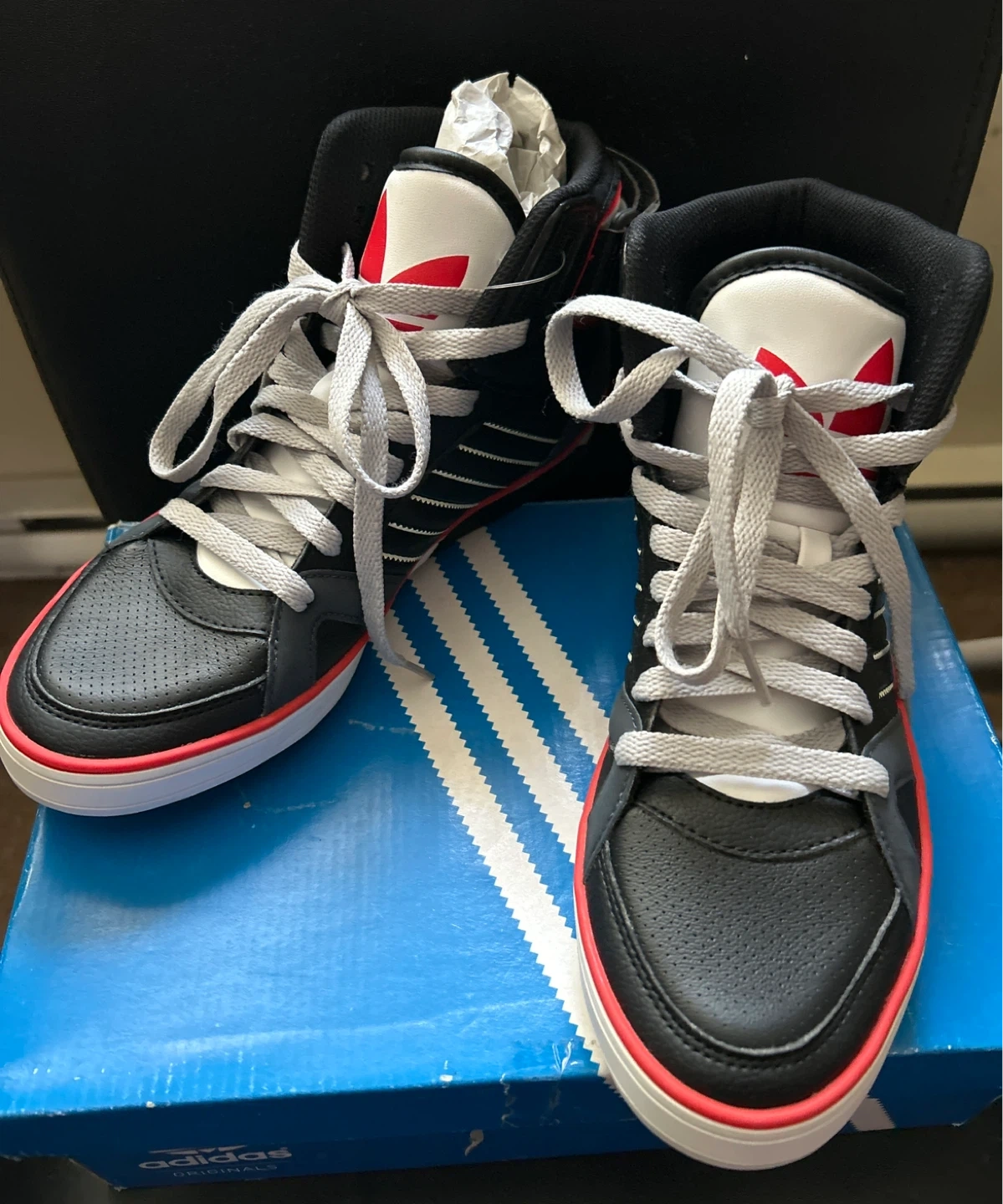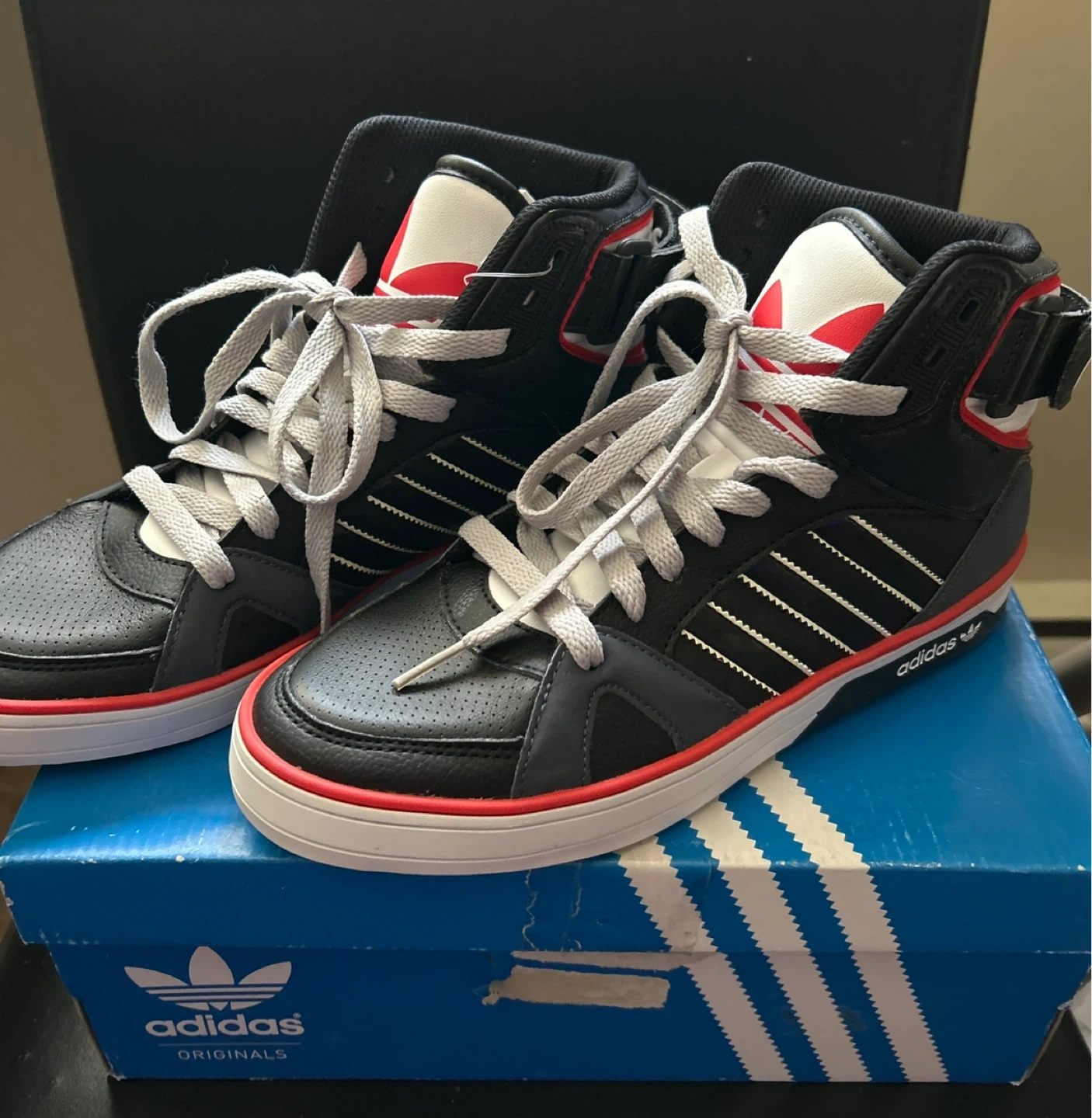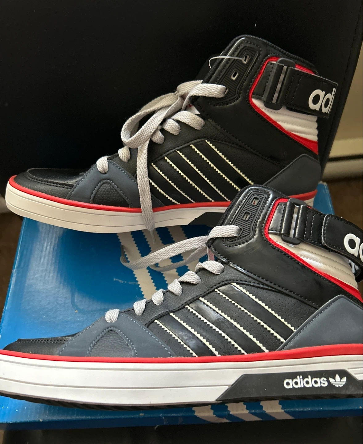 These New Adidas Space Diver sneakers feature a high-top design in a black, grey, and red colourway. They come with original laces and include the box. Perfect for casual wear! size 6/12 male.