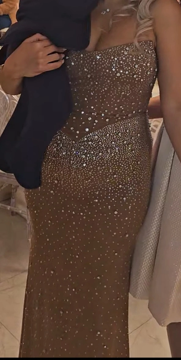 This elegant strapless gown is covered in sparkling rhinestones. It features a fitted silhouette and a floor-length hem. Perfect for a formal event or special occasion!