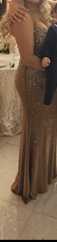 This elegant strapless gown is covered in sparkling rhinestones. It features a fitted silhouette and a floor-length hem. Perfect for a formal event or special occasion!