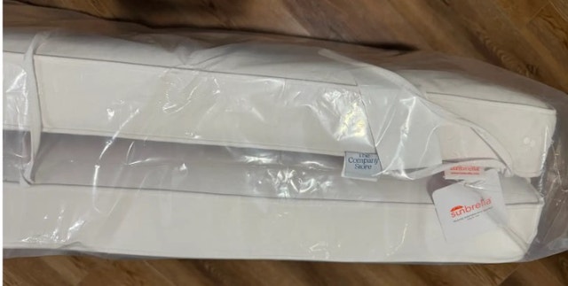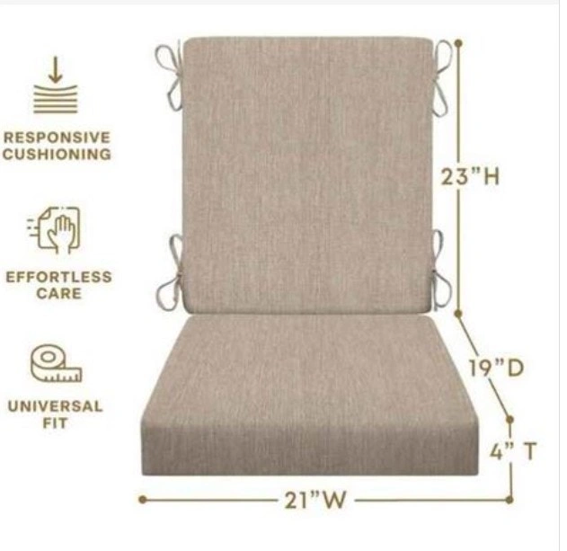 NEW Sunbrella Chaise Lounge Cushion, White Deluxe 80" x 23" x 3". Boxed construction. Overstuffed densified polyester fiber fill ensures your cushions will last several seasons. Fiber fill allows cushions to dry quickly if left out, just by laying them on their side. All cushions secure to furniture with 11.5 in. ties. Cushions are sewn shut. Made with Sunbrella® performance fabrics that are stain-, fade-, water-, mold-, and mildew-resistant. Sunbrella® performance fabrics carry against fading. Color goes to the core of Sunbrella® performance fabrics, which means the fibers are saturated with UV-stabilized pigments before they are woven into fabrics–rather than printed on after the fabric is made. For best results, store cushions in a flat position when not in use. The Company Store products are made of very high quality fabric with luxurious feel. Idee-Home 2Pcs Outdoor Cushions for Patio Furniture Retail) $112.90 Black cushion 28.5 x28.5 seat and back cushion $40 Waterproof Cover: The outdoor cushions are made of 300GSM high density polyester with waterproof PU coating. Patio furniture cushions effectively preventing water from splashing. Nice and thick patio chair cushions for daily using. Excellent Details: The outdoor seat cushions attached ties, ensure that the cushions are securely attached to your furniture. The outdoor chair cushions feature a hidden zip for easy care. Given Your Outdoor Furniture a Fresh Look: Our outdoor couch cushions have good performance while also having an eye-catching appearance. Choose comfortable and beautiful outoor patio cushions for your patio from basic beyond. Comfortable Foam: The replacement cushions for outdoors made of medium firm high-density foam, providing softness and support. It quickly rebounds and maintains its original thickness even with prolonged use, allowing for relaxation of the buttocks. Highback Dining Chair Cushion, Birch Tan (beige ) $35 Crafted with durable and beautiful fabrics, these cushions will resist the elements while remaining bright and beautiful for years to come. Finished & filled in the US with superior recycled polyester fiber for long-lasting comfort and support. Seat measures 21"W x 9"D x 4" thick, and back measures 21"W x 23"H x 4" thick. Cash accepted.