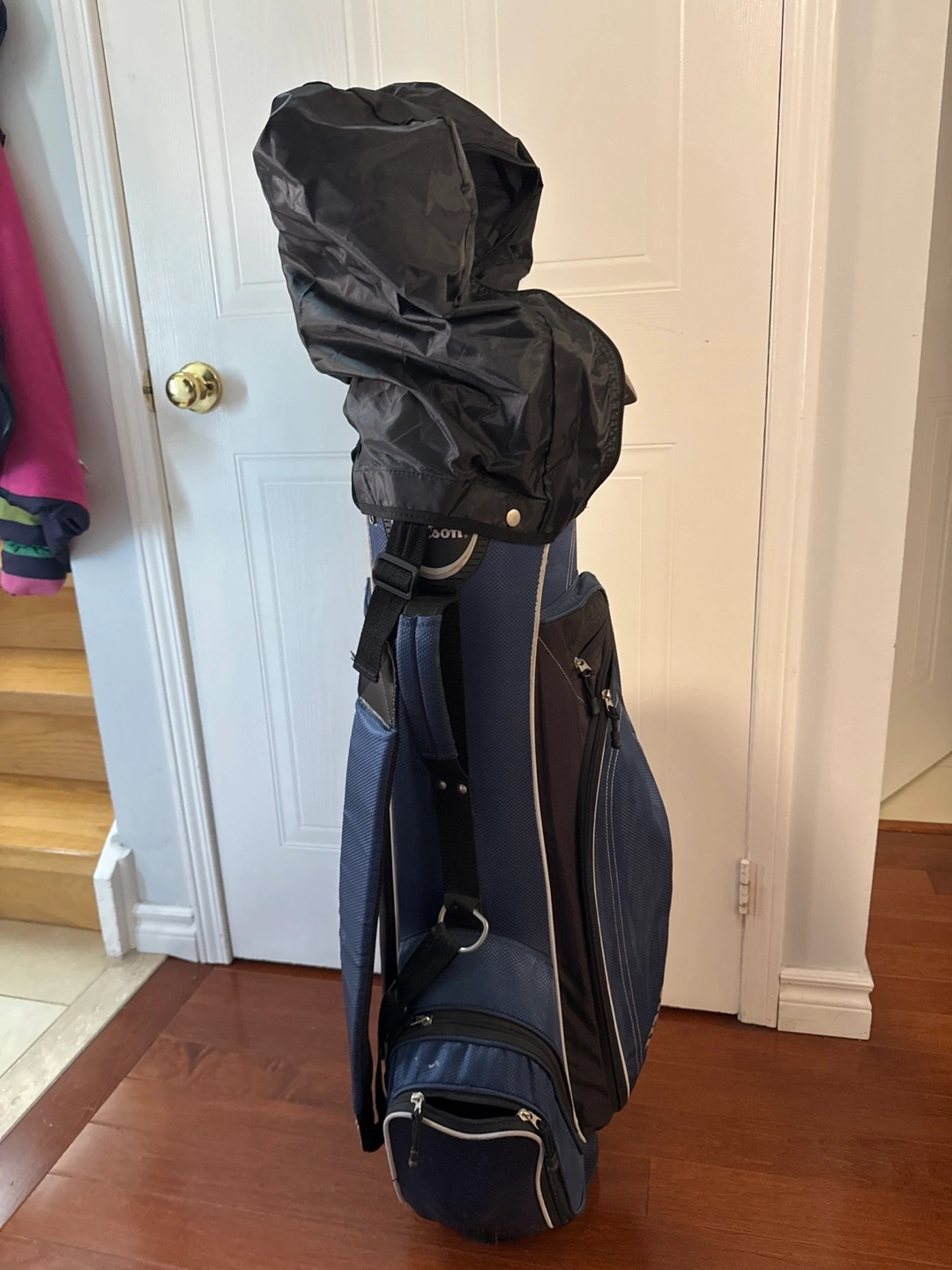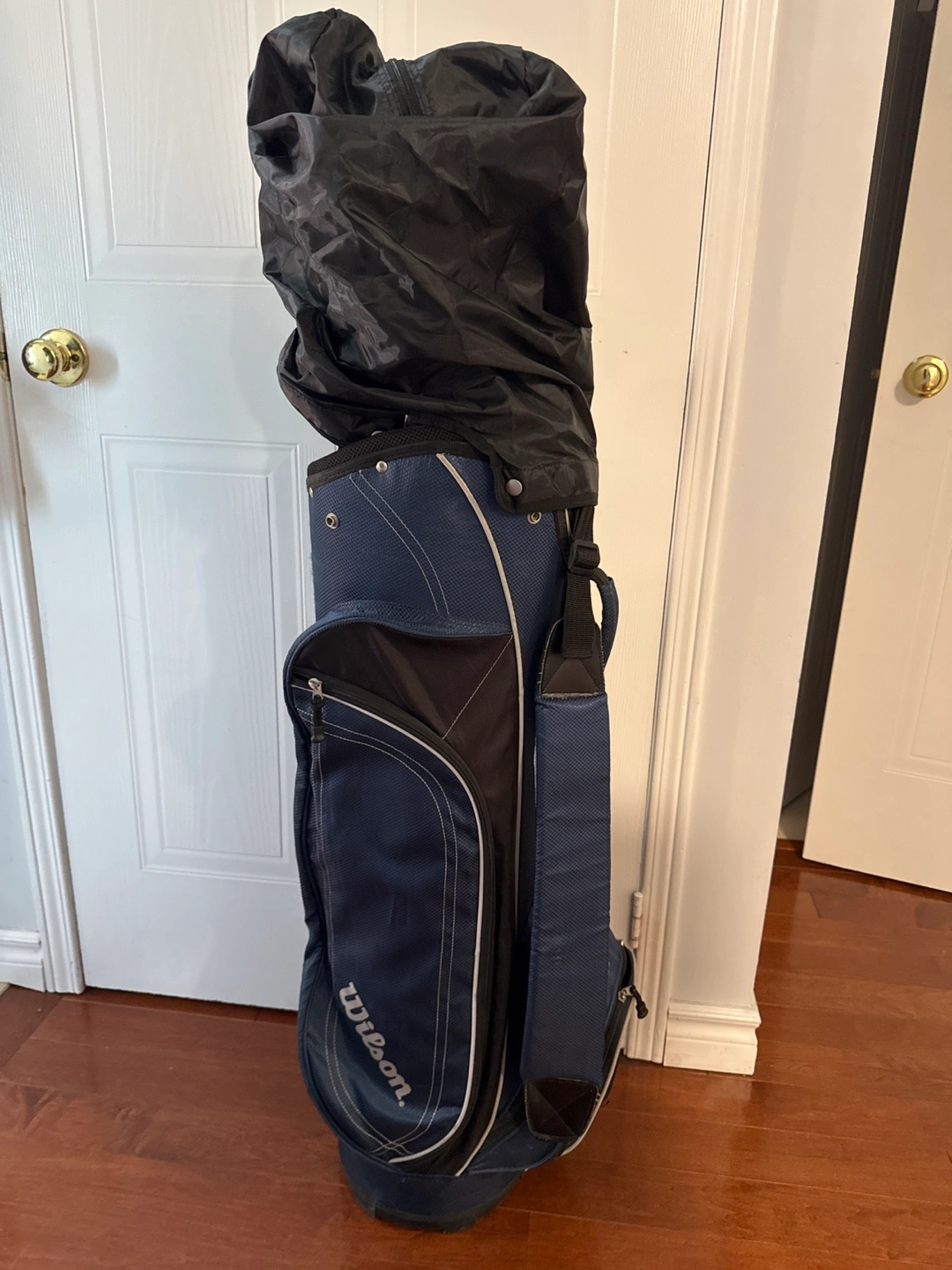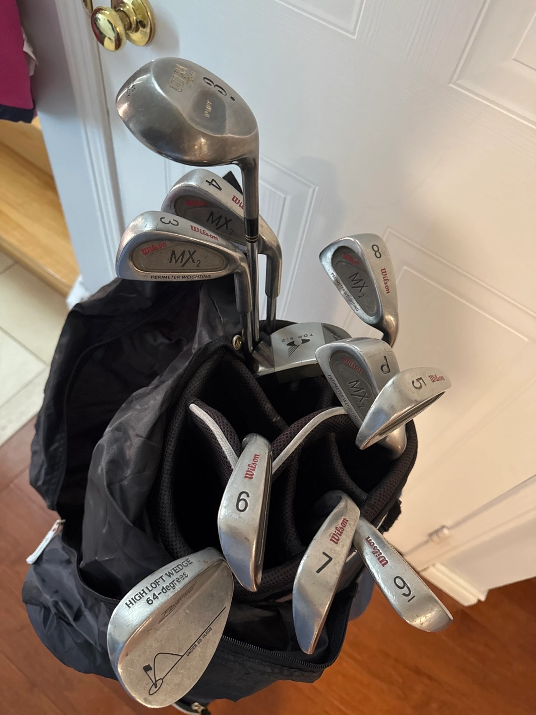 Pre-owned Wilson golf club set. Includes a variety of clubs and a carry bag. Great for beginners or casual players. Clubs show some wear but the bag is in pretty good shape. Pins, golf balls and pencils included.