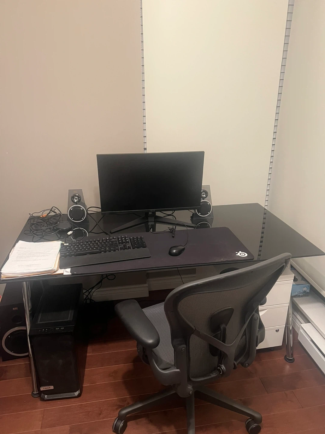 An IKEA Galant glass top standing desk. This adjustable height, contemporary piece has multiple settings for use as a work table, sitting computer desk and more. The model 18222 features smoked black glass on a chrome A-leg base. To change the height, turn legs counter clockwise. The numbered heights are shown on legs. This is practically the only desk that’s actually big enough to use multiple screens on or is a good gaming size without having to have a ton of storage attached to it. Selling due to relocating and lack of space. The glass top has average marks and some small scratches. Comes from a Smoke and Pet Free home.