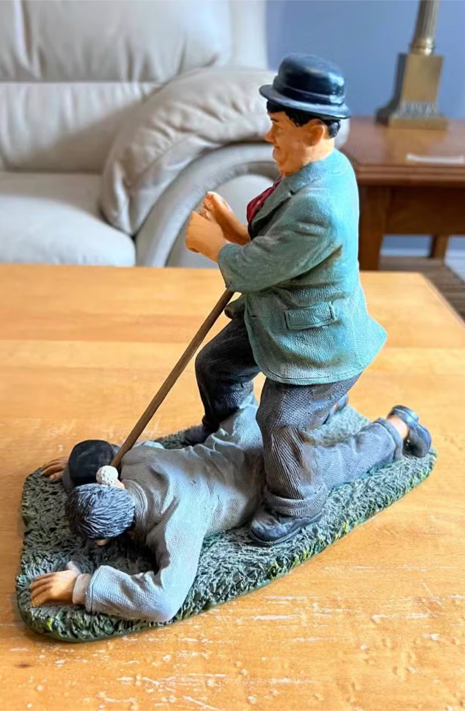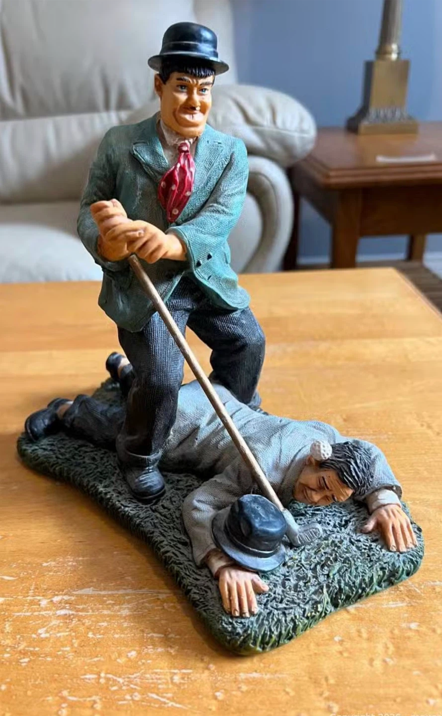 This is a Charlie Chaplin golfing figurine in great condition! It's a unique piece for any collector or fan of the iconic comedian. The figurine depicts a humorous scene with Chaplin and another golfer. It would make a great addition to any home or office