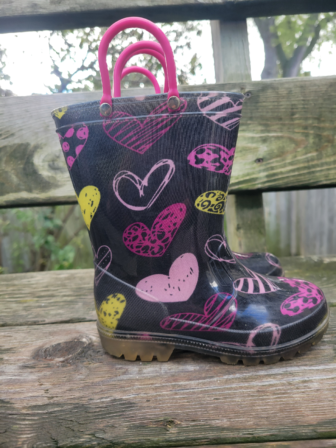 Cute pair of kids rain boots! They're black with a fun heart pattern and pink handles. Perfect for puddle jumping! SIZE 9 girls