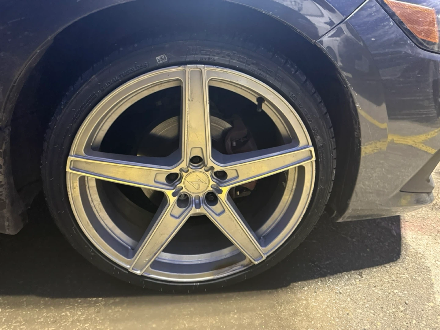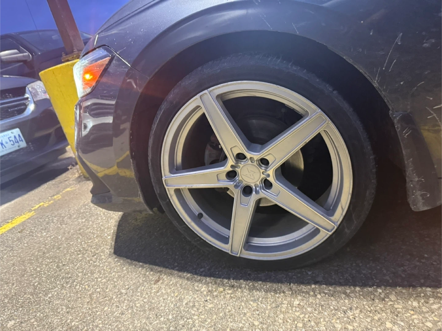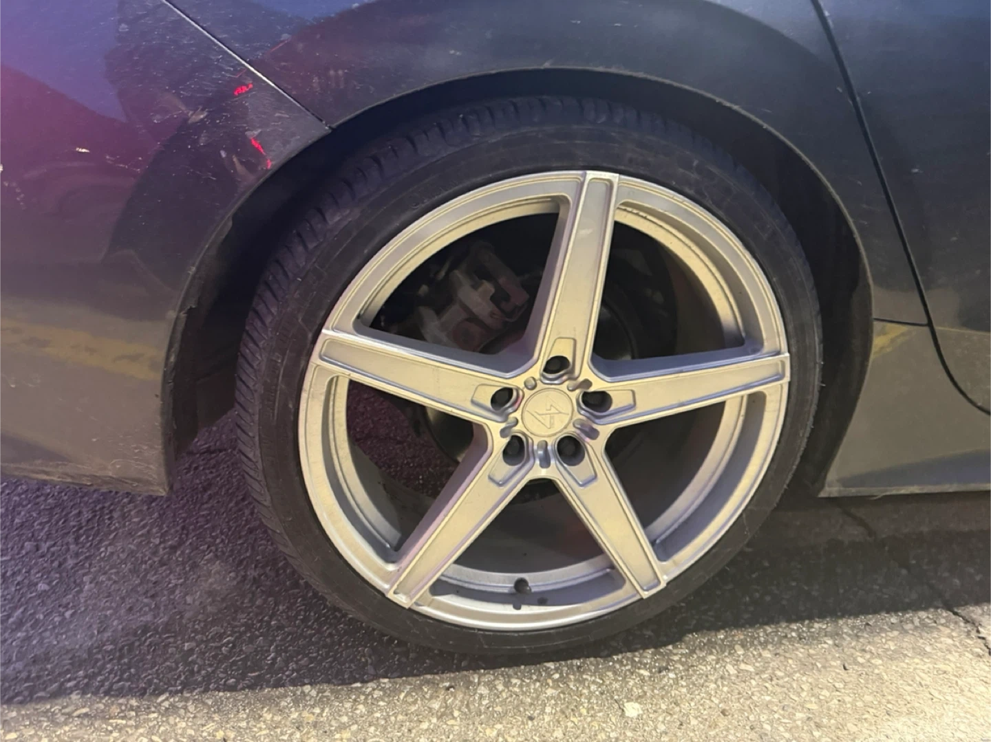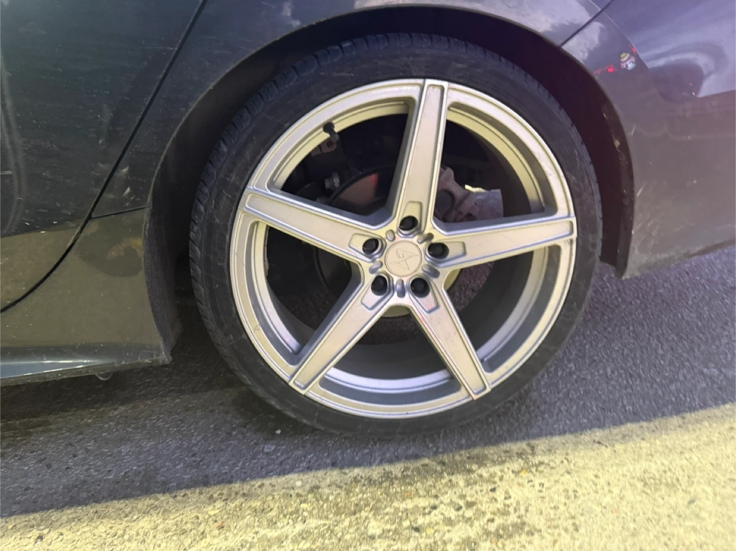 These are aftermarket alloy wheels in a silver finish. They have a distinctive 5-spoke design. The wheels are standard size, suitable for many vehicles. They're in good condition, ready for a new car!