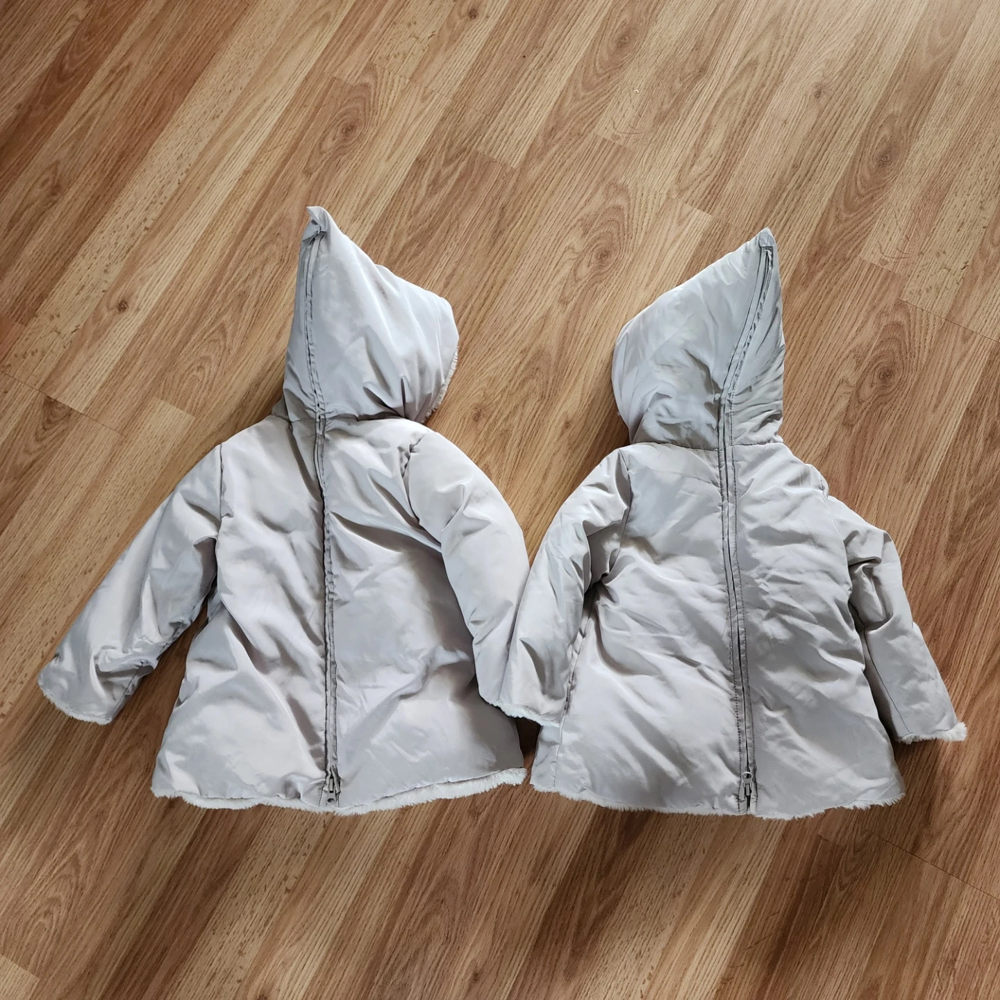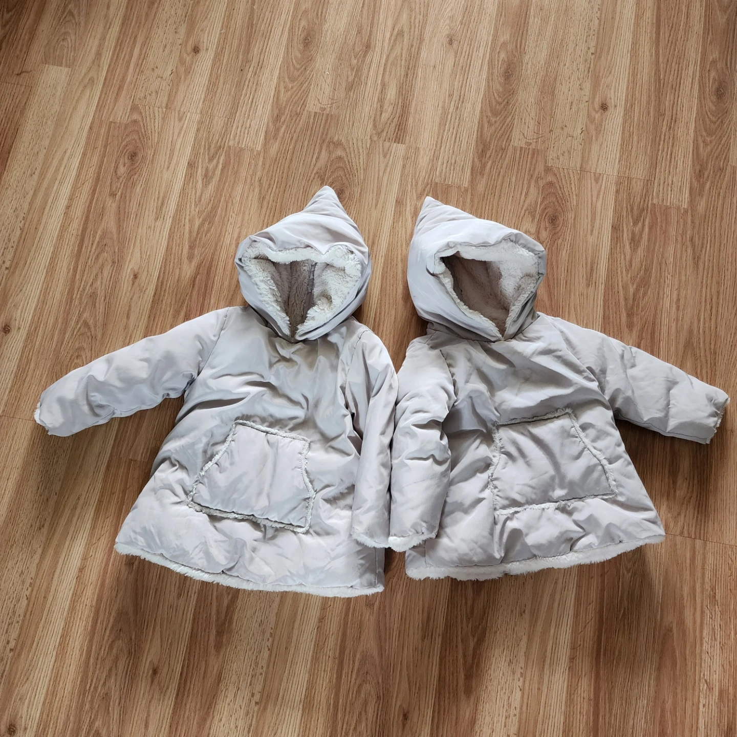 Two Zara baby winter jackets with cozy faux fur lining. One is size 2-3 years (CM 98) and the other is size 3-4 years (CM 104). Both are light beige with hoods and front pockets.