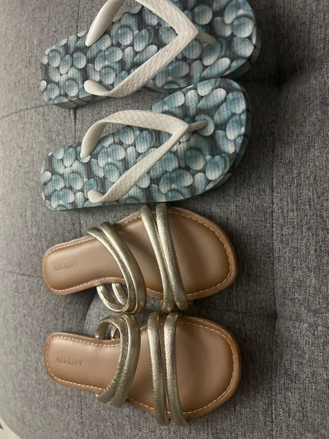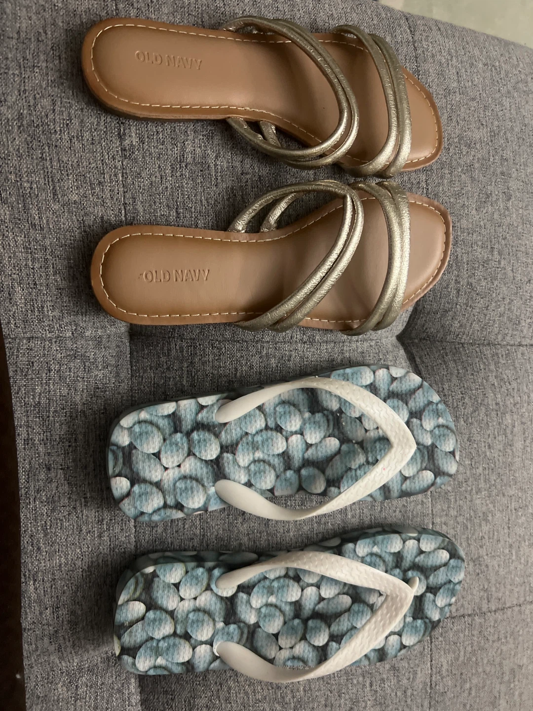 Selling a bundle of Old Navy sandals in size 6. Included are a pair of gold strappy sandals and a pair of blue and white patterned flip-flops. Both are in good condition and ready for summer!