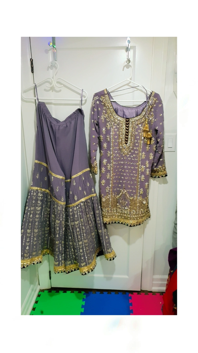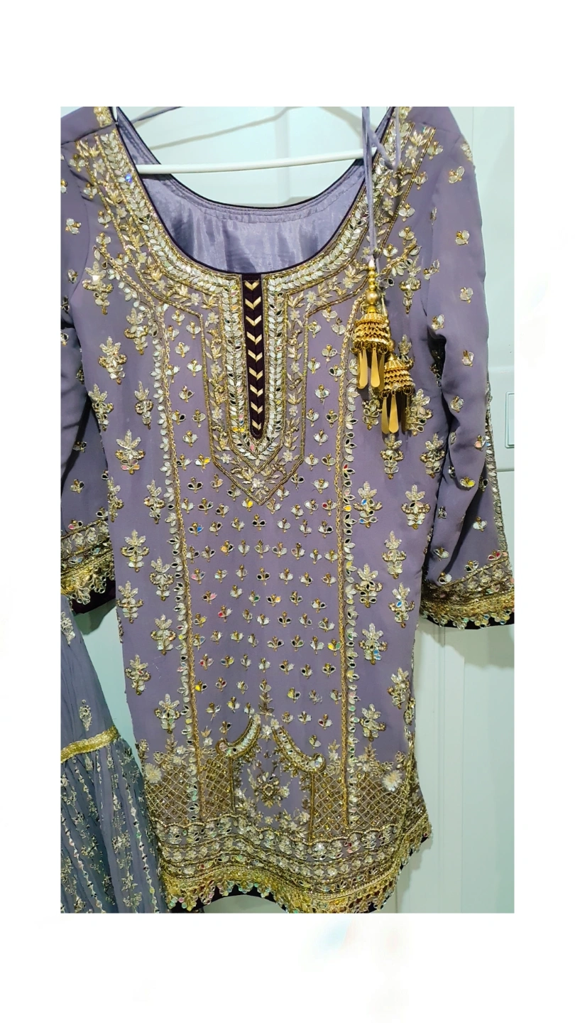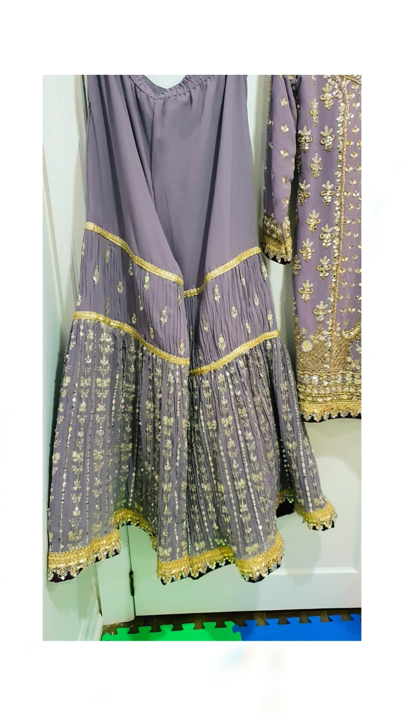 Beautiful three-piece partywear sharara suit. Purple top with gold embroidery. Matching pleated gharara. Dark purple dupatta. Stunning detail. Perfect for special occasions.