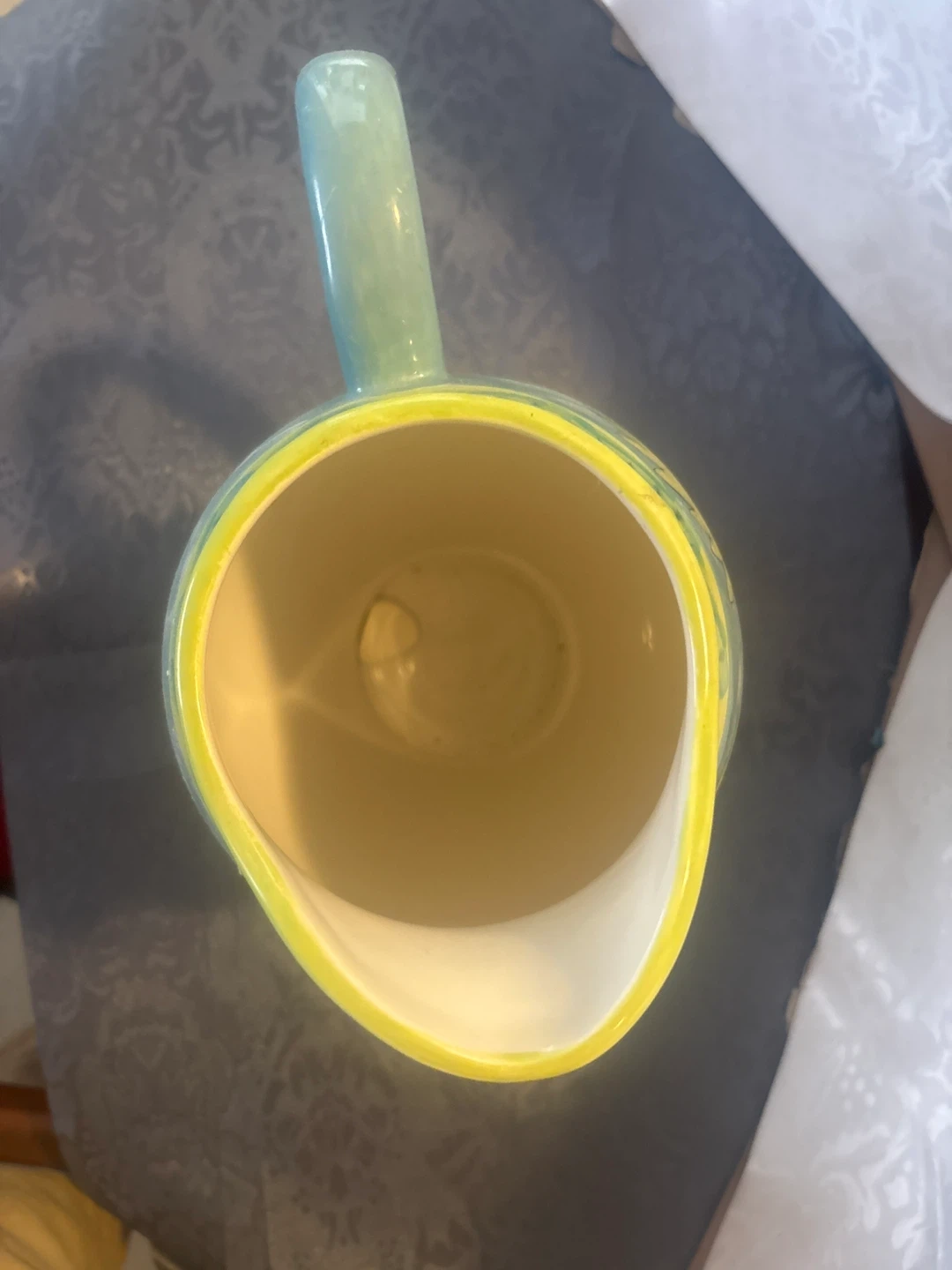 This decorative ceramic pitcher features a light blue body with a yellow floral design. The rim and base are accented in yellow. It's perfect for holding flowers or as a standalone decorative piece. Ceramic material.
