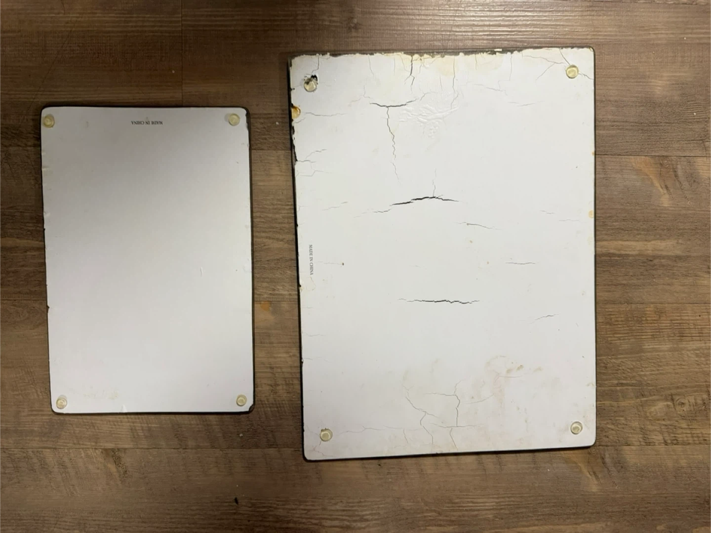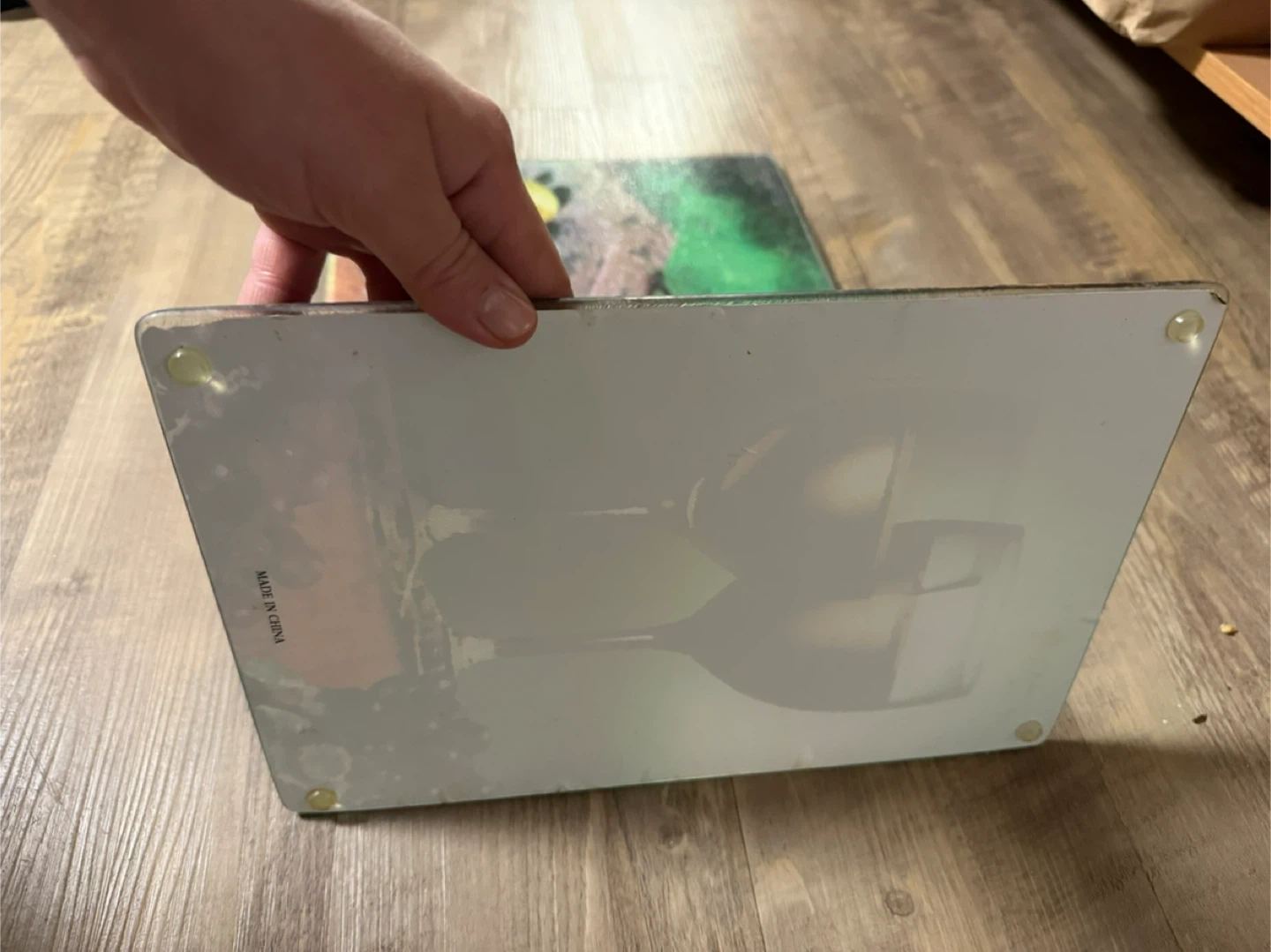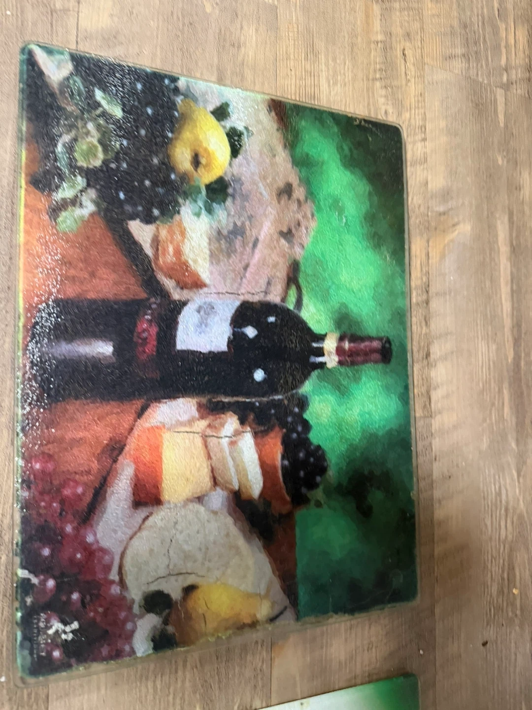 This set includes two glass cutting boards, one larger and one smaller. Both feature colourful wine and cheese themed designs. They're made of glass and have rubber feet for stability.