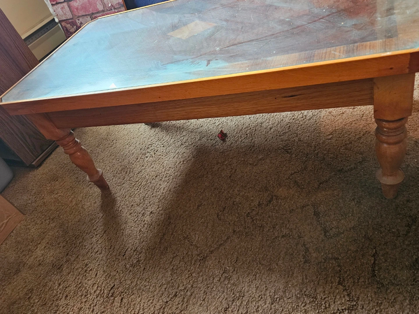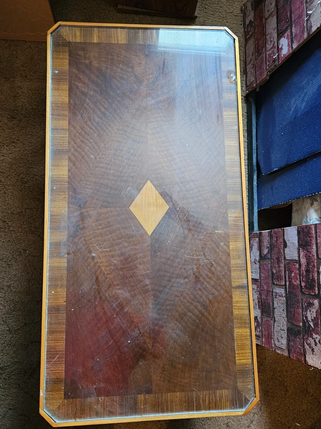 Selling a vintage coffee table with a glass top. It has a unique wood grain design and a classic look. Perfect for adding a touch of retro style to your living room!