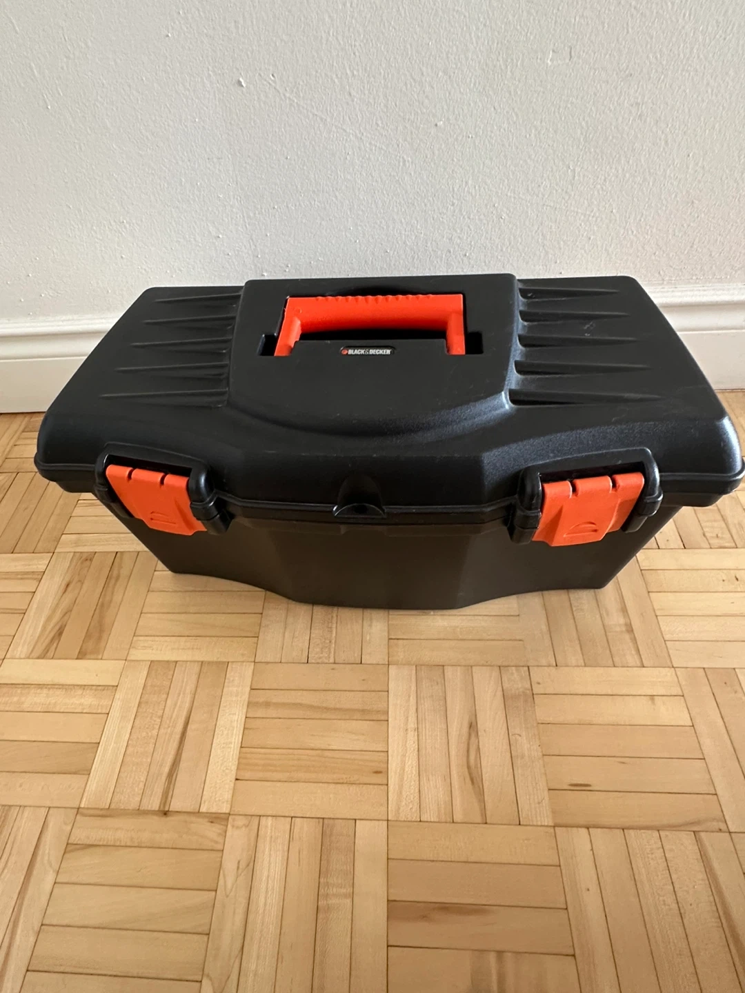 This is a black plastic tool box by Black & Decker. It has orange latches and a bright orange handle. The lid has compartments for organizing smaller items.