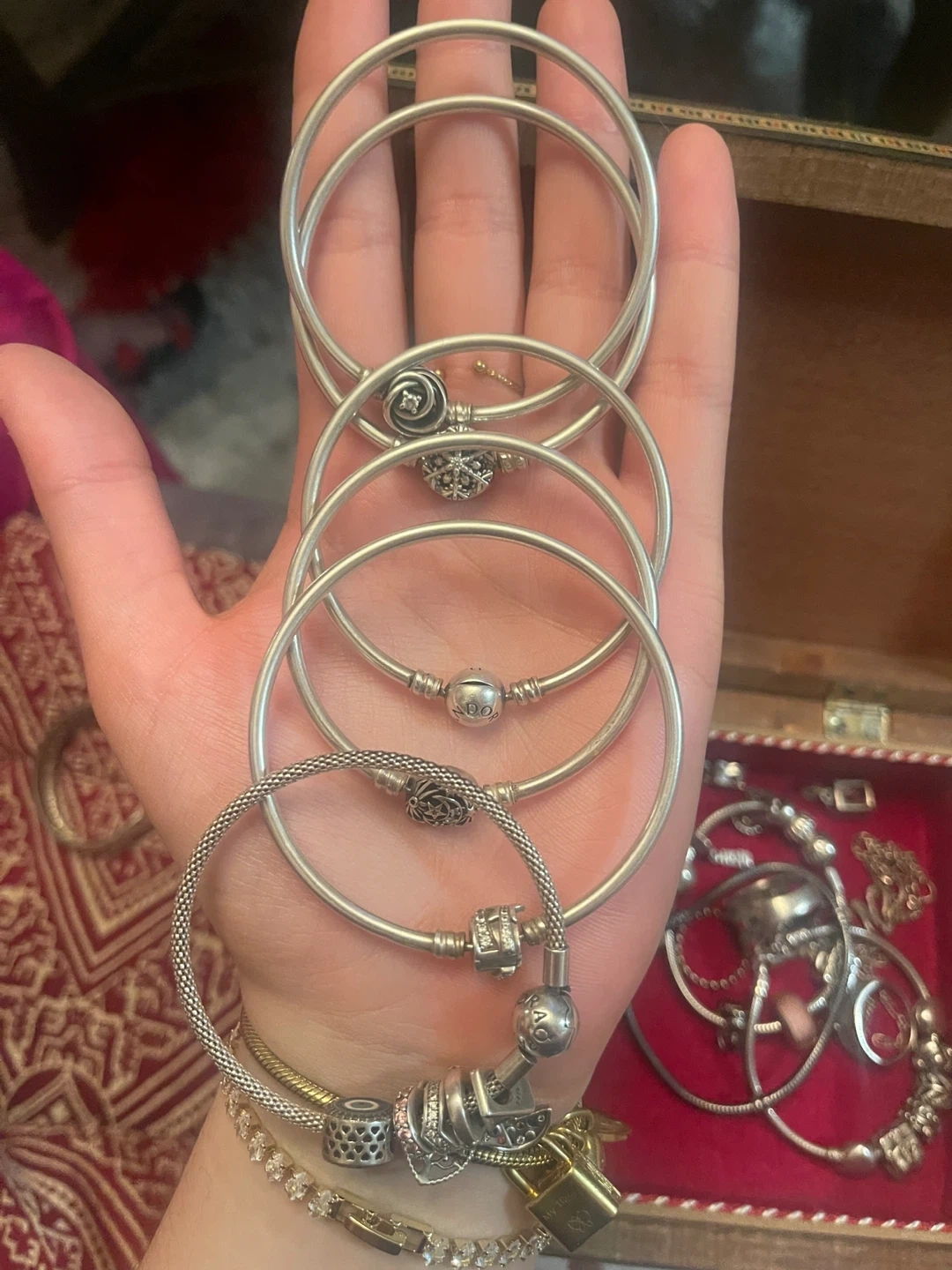 Set of four sterling silver Pandora charm bracelets. Each bracelet features a unique design with various charms attached, including a rose, snowflake, and a lock. Silver metal.