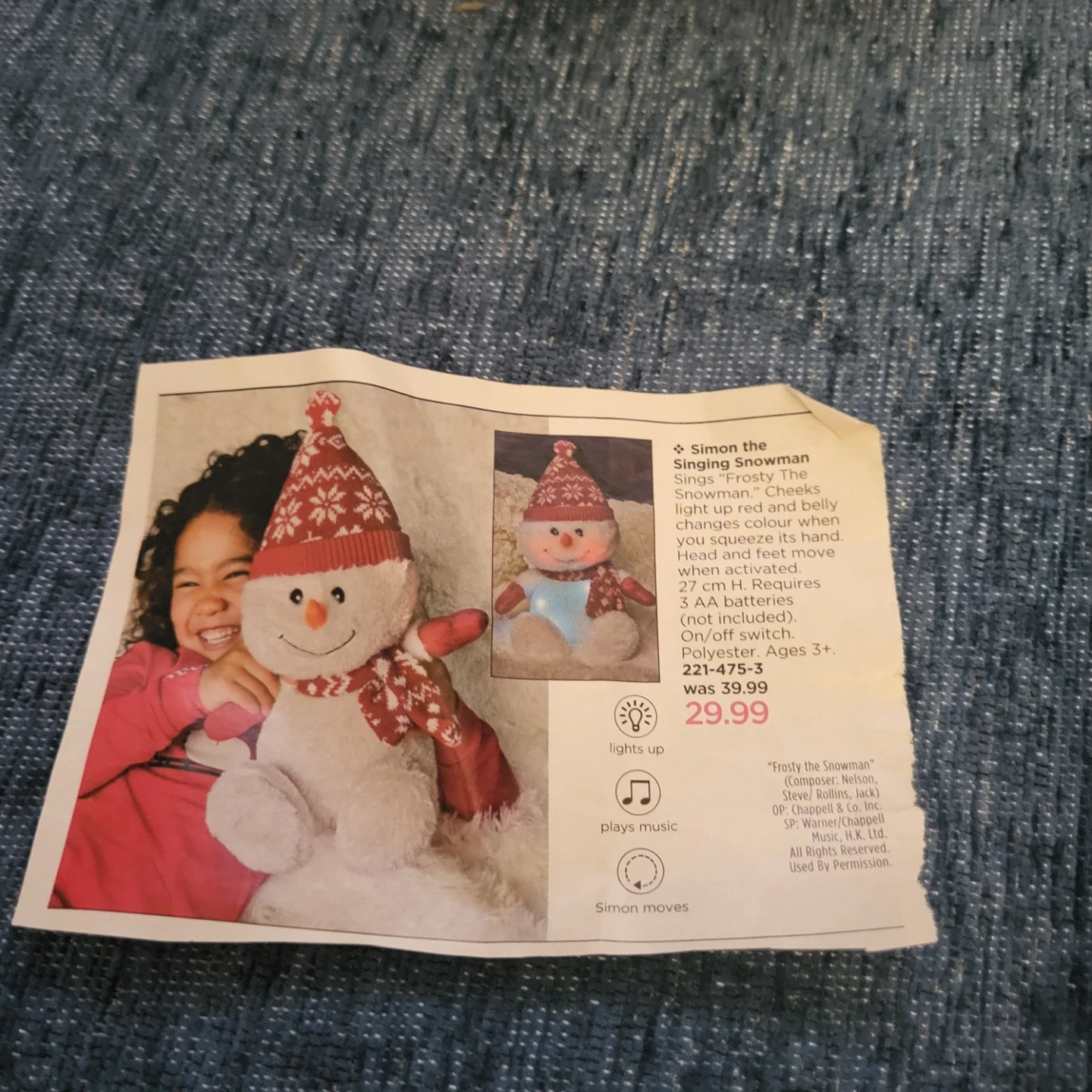 Buy & SellSimon the Singing Snowman PlushSimon the Singing Snowman Plush$30Simon the Snowman plush lights up and changes colour. He moves and plays music when activated. Requires 3 AA batteries (not included). Ages 3+.ConditionNewAge3-5 yearsWHERE TO MEETHopewell AvenueView MapSELLERverifiedEddaBriar Hill - Belgravia36824 reviews0 chats·0 favorites·1 viewsSEND CHAT TO SELLERHi Edda! I’m interested in your listing.Hi Edda! I’m interested in your listing.Get the Karrot app to chatSign In to chat