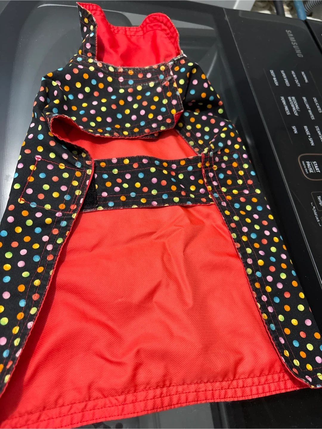 This adorable small dog coat is reversible with a vibrant red & fun black /polka dot pattern. It has a velcro closure for easy on and off. Perfect for keeping your small furry friend dry… and stylish on walks.. *Best for 15–22 pound dog