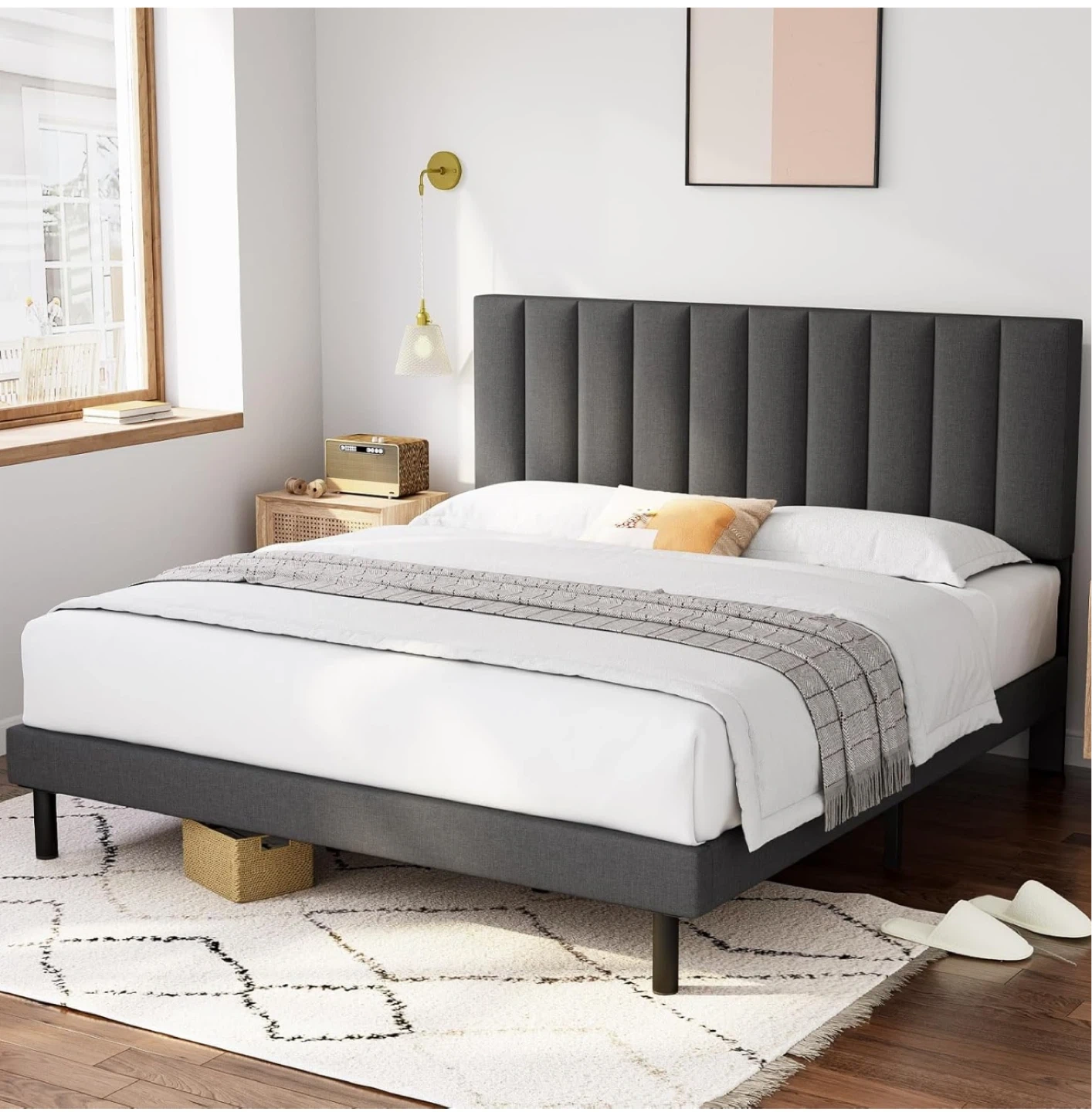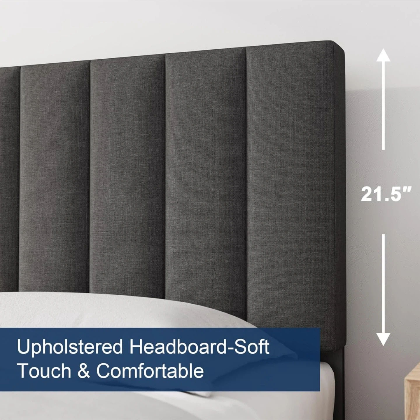 This king size platform bed frame features a dark gray upholstered headboard with a soft touch. It offers 7" of clearance for storage underneath and has a weight capacity of 900 lbs. Assembly takes approximately 30 minutes.