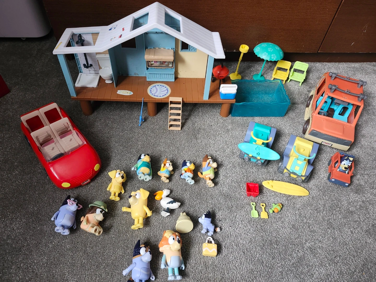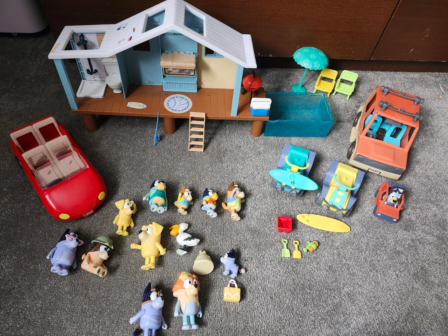 This playset includes the Bluey family, a beach house, pool, and various accessories like chairs, a BBQ, and vehicles. It's perfect for recreating fun beach adventures! All items shown are included.